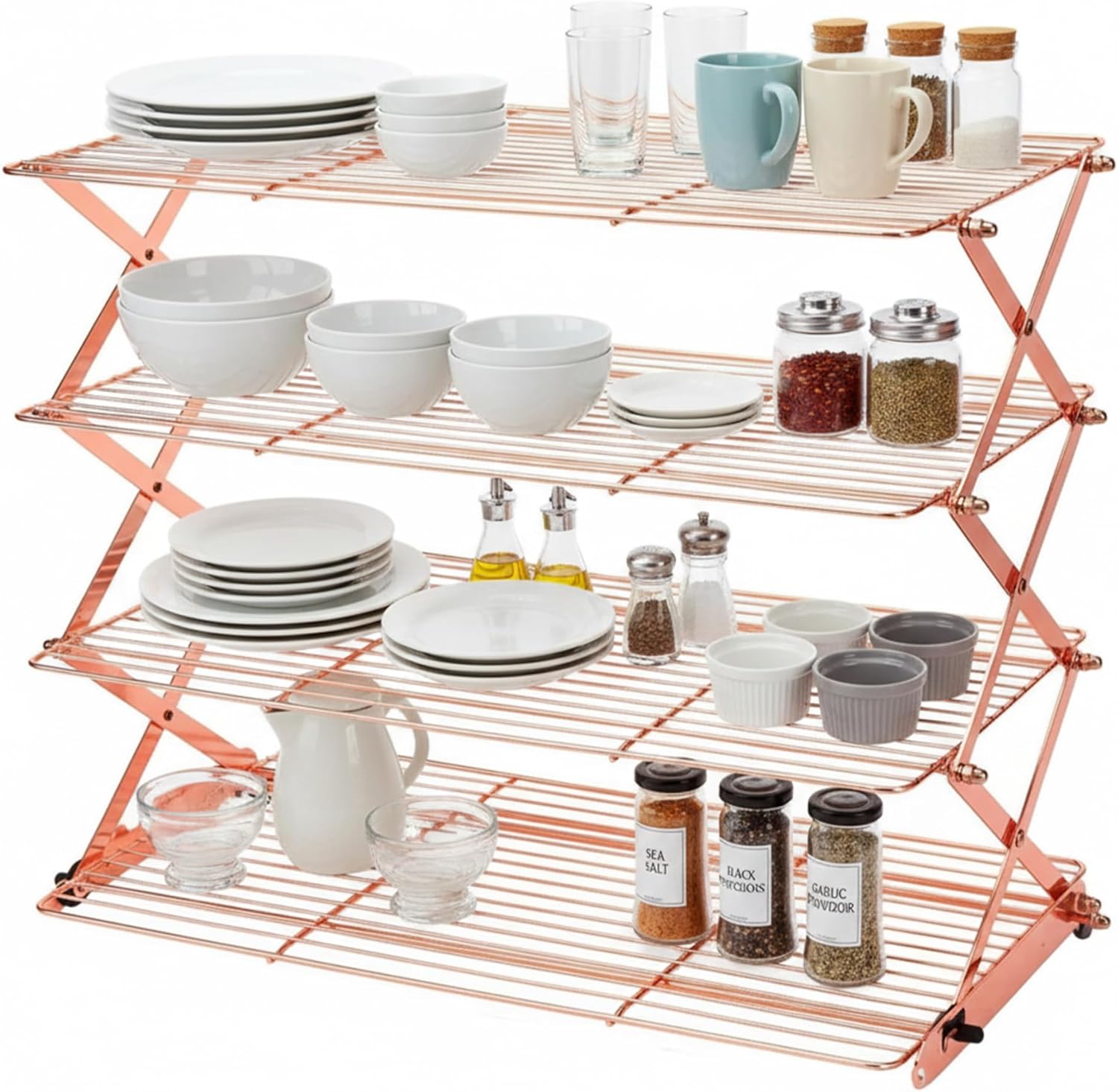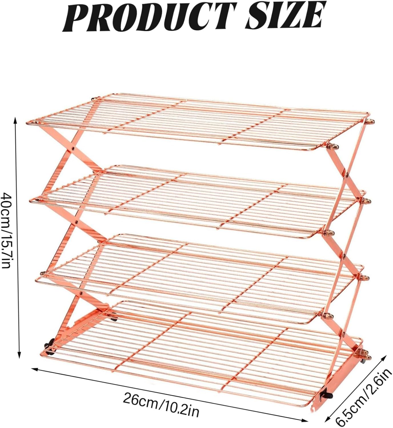 Description: This hollow-out 4-tier collapsible cooling rack is the ideal solution for baking enthusiasts who need efficient cooling while saving kitchen space. Featuring a stackable design with a secure locking mechanism, this cooling rack holds multiple layers of cookies, cakes, roasts, and grilled foods without compromising stability. The ventilated, hollow-out structure promotes rapid, even airflow to cool baked goods thoroughly and prevents buildup for crumbly, fresh results. Crafted from , kitchen-grade materials, it withstands high temperatures and heavy loads, making it perfect for various cooking methods from cooling to roasting. The collapsible feature allows the rack to fold flat for easy storage in small kitchens or baking stations. Additionally, this rack is simple to clean with detachable tiers and smooth surfaces that resist sticking and buildup. Ideal for both amateur bakers and professionals, this multipurpose cooling rack enhances baking efficiency, improves air circulation, and makes a compact, space-saving solution tailored to your culinary needs. Features:. -Color: Rose Gold. -Material: carbon steel. Note:Manual measurement, please allow slight errors on size.The colors may exist slight difference due to different screens. Package Including 1 * Collapsible Cooling Rack
