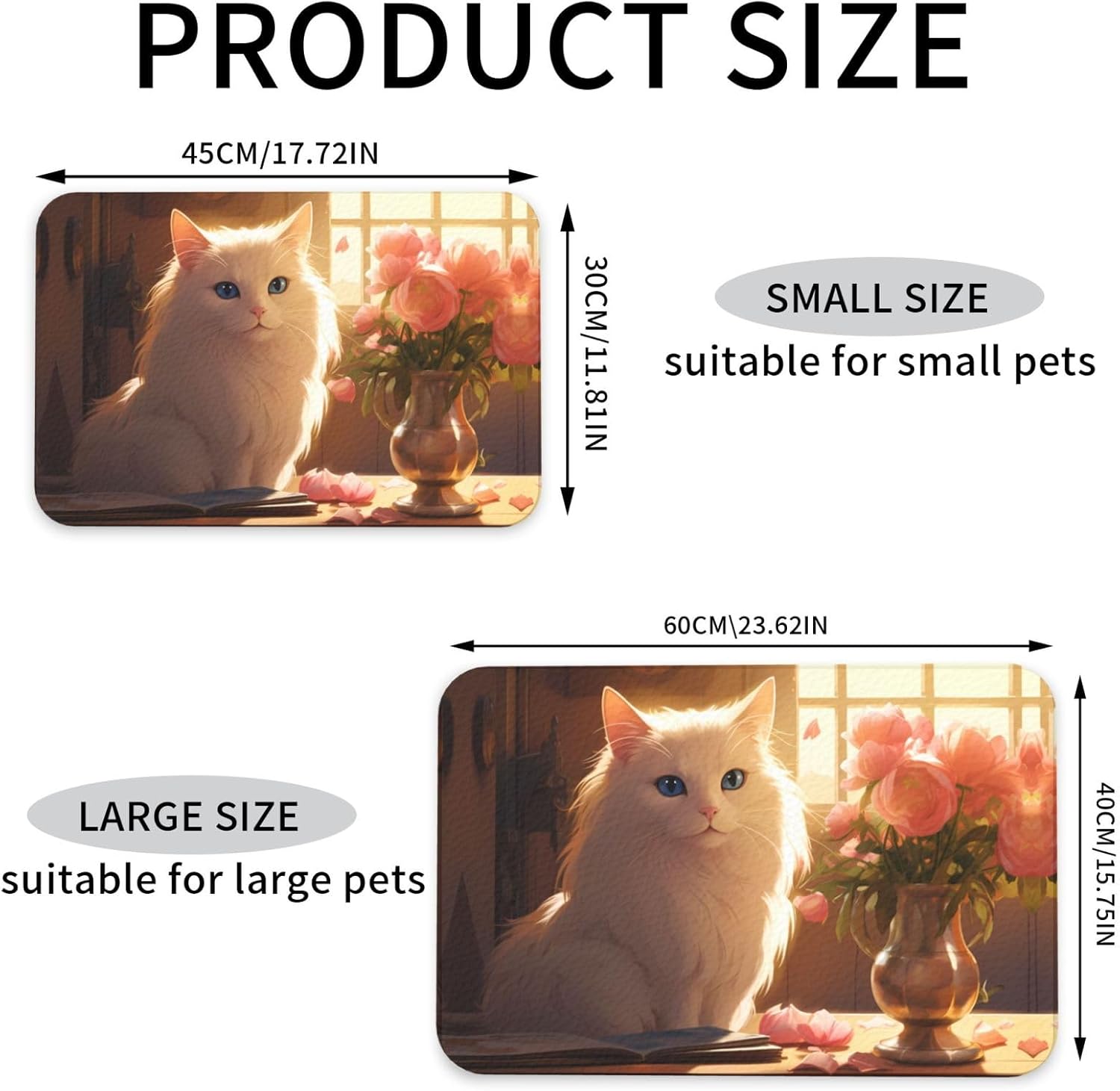 WZYCWB Tibetan long-haired cat Material description Surface: PU, bottom: rubber\r\nProduct performance This pet tablecloth can prevent liquid spills. Super strong water absorption and quick drying ability, avoid getting pet paws wet, and keep the pet's eating environment clean. When food and water fall on the dog food mat, no traces will be left. Unlike traditional silicone pet feeding mats, our pet feeding mat will not be stained with pet hair or dust, nor will it form scale that is difficult to clean. When not in use, it can be rolled up for easy carrying and space saving. The non-slip rubber pad on the bottom keeps the dog mat in place no matter how your pet pushes it. The waterproof rubber bottom prevents water from seeping into the floor. The food and water on the pet bowl mat will not cause floor corrosion, reducing wear and tear on the floor. \r\nApplicable scenarios Suitable for dogs, cats or other pets. It can be used for pet food and water bowls or automatic feeders, and can also be used as a special mat for pet bowls. \r\nWashing instructions It can be washed or scrubbed, cannot be bleached, and dried naturally. \r\nSpecial instructions Due to different measurement methods, the size data has an error of 1-3cm, which is normal.