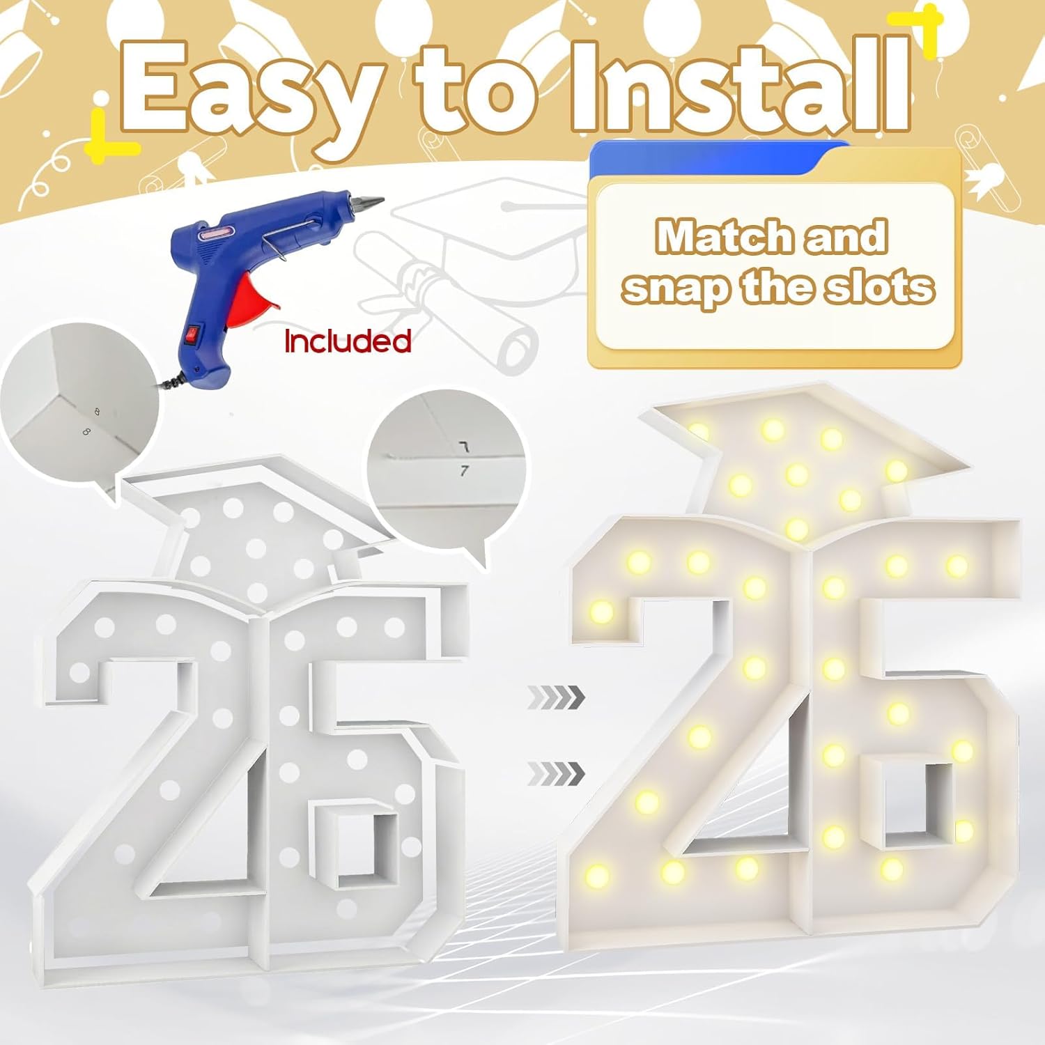Light Up Your 2026 Graduation CelebrationMake your graduation party unforgettable with our upgraded 4.5FT one-piece Light-Up Number 26 with Graduation Cap. The connected design keeps both numbers firmly together for enhanced stability, creating a bold and eye-catching centerpiece. Perfect for Class of 2026 celebrations, this glowing decoration adds visual impact to both indoor and outdoor setups and makes a stunning photo backdrop for your milestone moments.Product HighlightsEnhanced Stability: The upgraded one-piece design keeps the numbers firmly connected, preventing tipping or bending. Sturdy yet lightweight, it’s ideal for repeated use.Large & Eye-Catching Size: Standing 4.5FT tall, the “26” and graduation cap create a bold focal point. Perfectly sized to make a statement without overwhelming your space.Easy DIY Assembly: Slot-in design allows quick assembly. Numbers and slots are clearly labeled, so you can snap everything together and install the lights in under 30 minutes.Versatile Decor: Use as a graduation centerpiece or pair with balloons, flowers, or other decorations for birthdays, anniversaries, or other celebrations.What’s IncludedPre-cut foam board number “26” (one-piece design)Graduation cap decorationLED light stringsHot glue and double-sided tapeInstruction manualBatteries not included. Handle foam boards carefully during assembly.