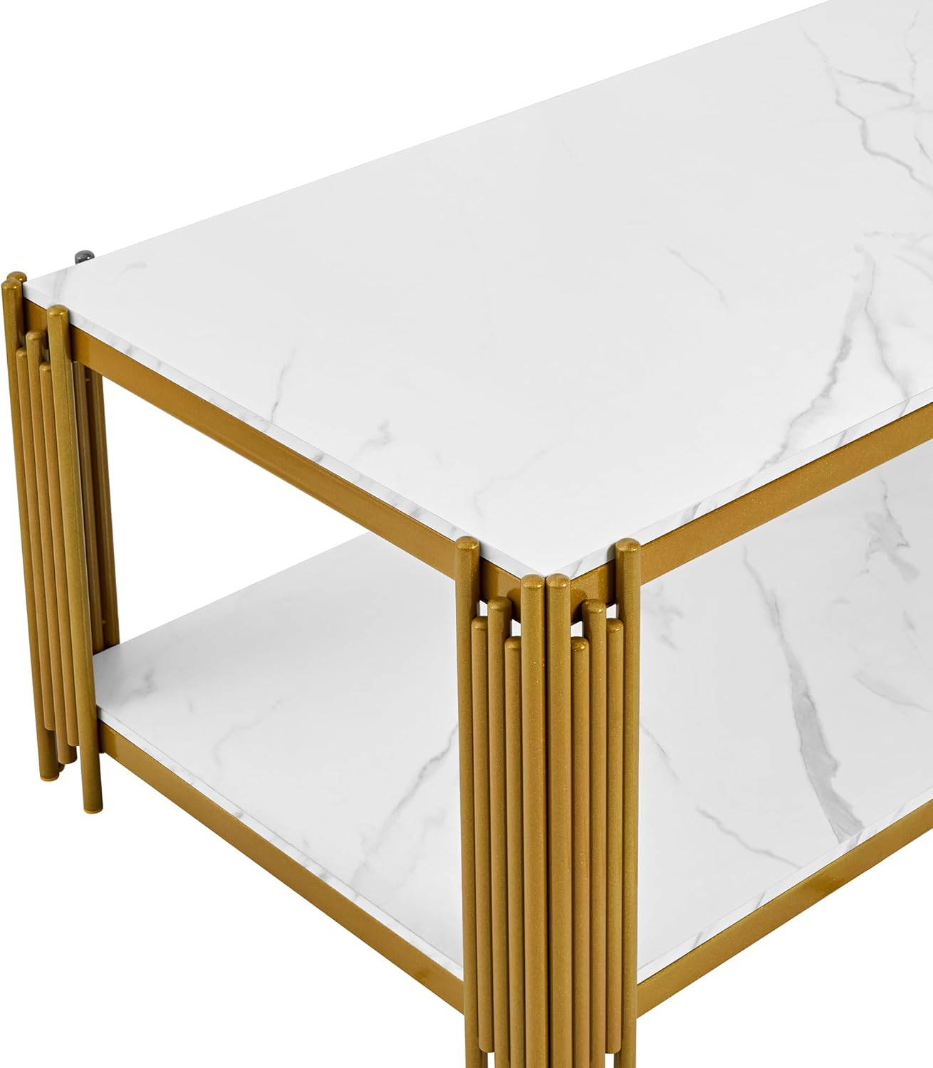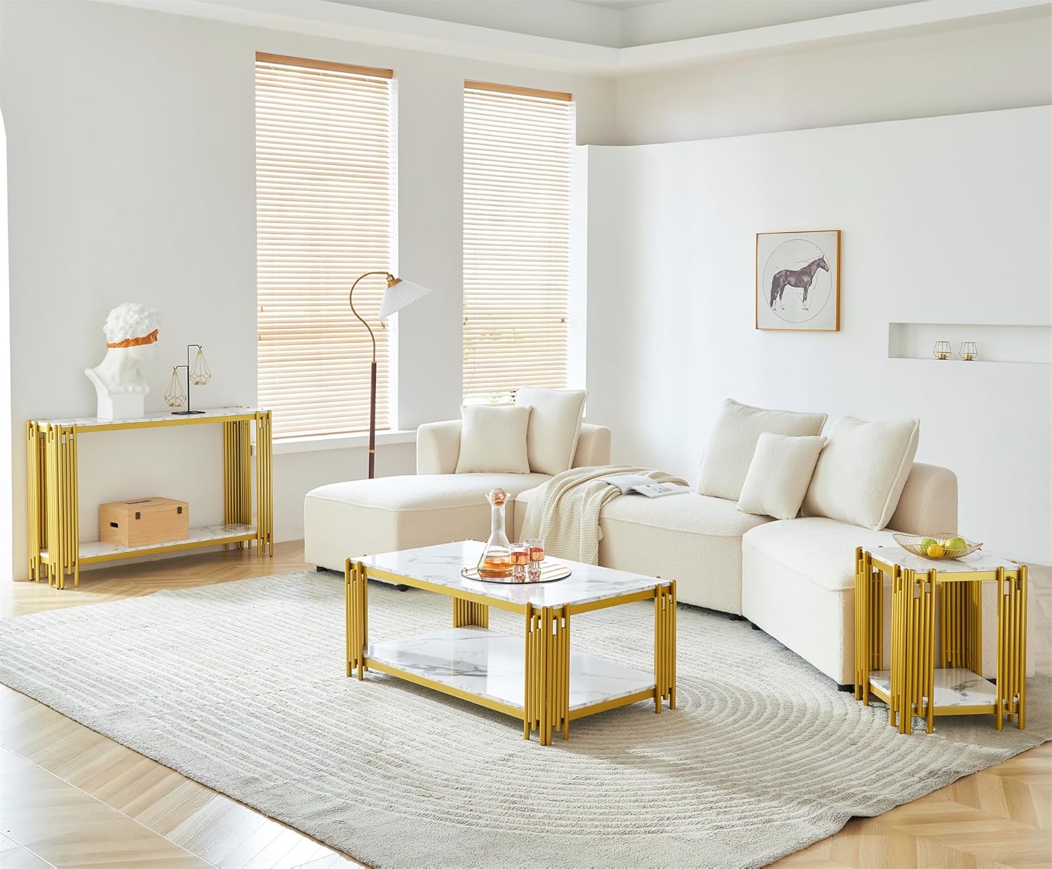♥ Bring a beautiful touch of modern to your home with the living room table. ♥ With two white faux marble shelves and Irregular cylindrical metal pipe welding. ♥ Add a pop of industrial chic to your home with this striking console table. ♥ Metal pipe and faux marble are easy to clean and durable for beauty that will last. ♥ This sofa side table set is designed to stand out in your home.