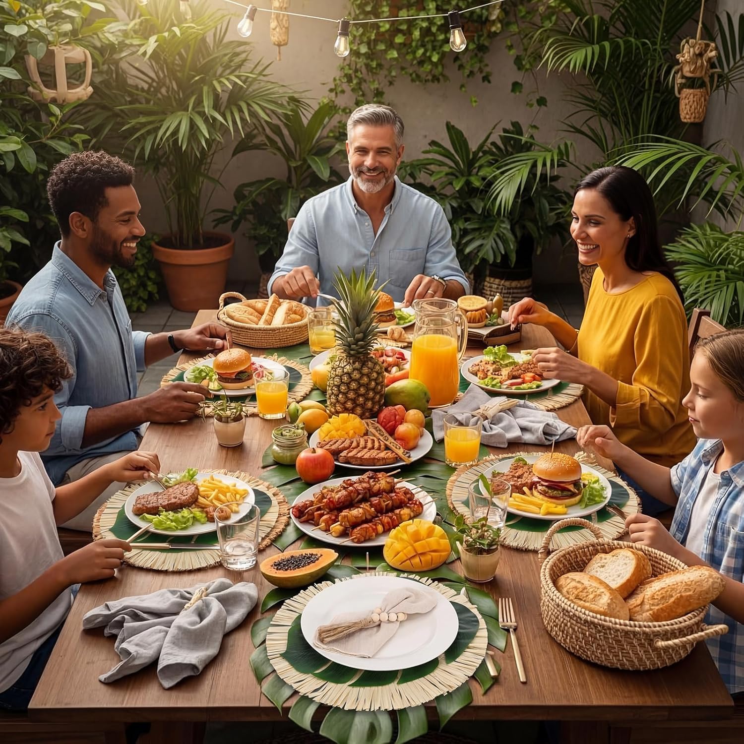 features: achieve a pinterest worthy aesthetic in minutes you do not need to hire a professional event planner to host a visually breathtaking dinner; this thoughtfully curated tablescape bundle brings the highly sought, aesthetic straight to your home, the smooth, vibrant green of the rubber leaves with brilliantly against the rustic, earthy tones of the fringed paper mats and twine; it is the shortcut to creating an instagram worthy table presentation that will leave your guests in awe. practical elegance designed for reuse while designed to create a spectacular visual impact for your most important events, the components of this set are built with lasting utility in mind; the 100% pure cotton napkins can be machine washed and reused for everyday family dinners; the wooden bead rings and soft rubber leaves are highly durable and easy to wipe clean, ensuring you can pack them away and recreate that magical tropical atmosphere for many summers, birthdays, and anniversaries to come. specifications: material: multiple materials color: green etc. size: straw placemats about 14.96 inches/38 cm in diameter monstera placemats about 13.78 x 11.42 inches/35 x 29 cm wooden bead napkin rings about 7.09 x 3.15 inches/18 x 8 cm linen napkins about 16.54 x 16.54 inches/42 x 42 cm package includes: 12 x straw placemats 12 x monstera placemats 12 x wood bead napkin rings 12 x napkins cloth notes: manual measurement, please allow slight errors on size. the color may exist a slight difference due to different screen displays.