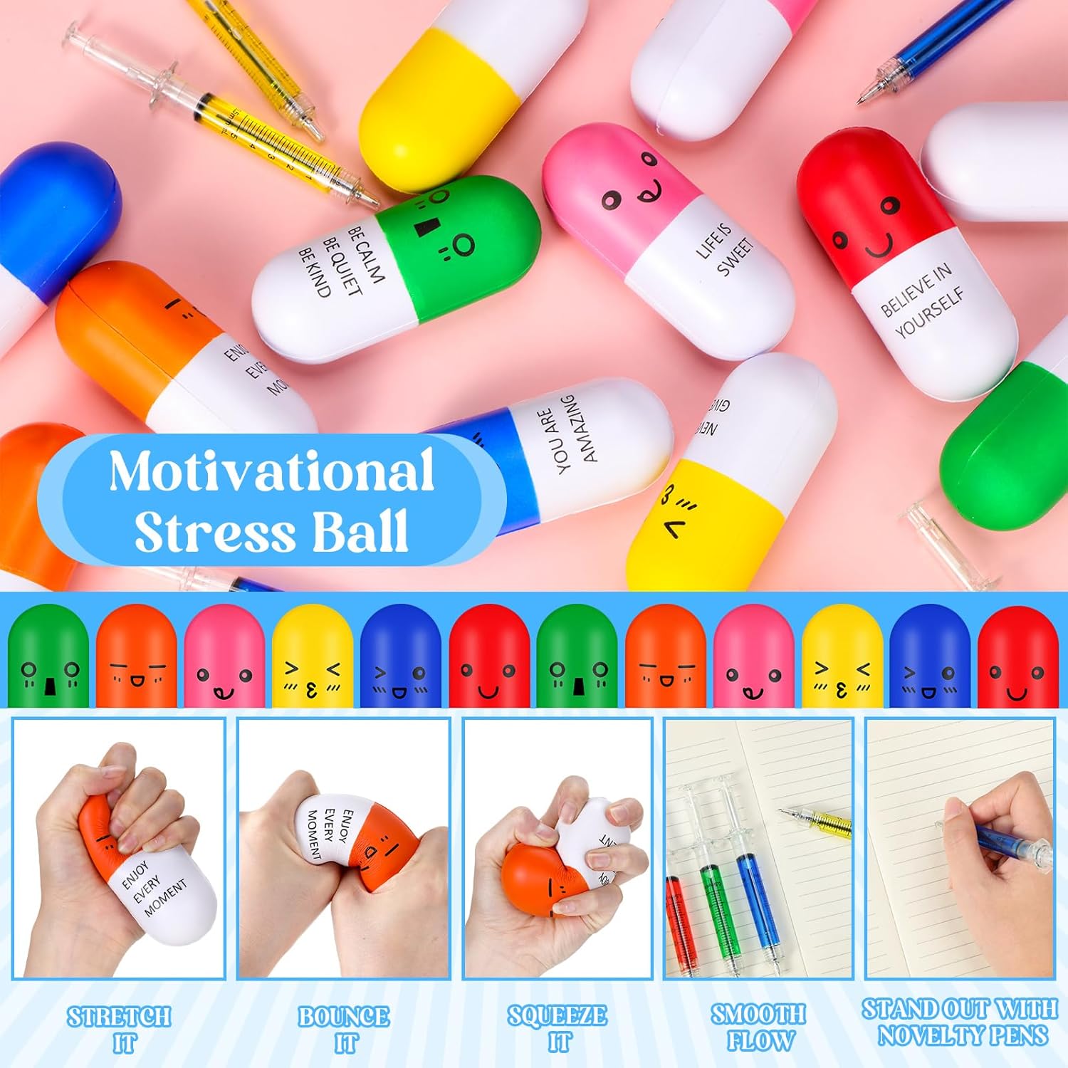 Features: Relieve stress and relax muscles with our practical yet fun stress balls for office. Create your way to relaxation with our pens. Whether under stress or just for fun, our stress balls and pens can pave your way to a stress free lifestyle. Get ready to dive into the sea of colors with our stress balls and novelty pens. Our pack includes delicately crafted stress balls in bright hues of blue, red, pink, green, yellow, and orange. Not to leave behind, our pens parade in the exciting colors of blue, yellow, green, and red. These vibrant colors are bound to keep you energized and add a pinch of fun to your dull days. Specifications: Material: Stress ball: mainly PU foam Main color: Stress ball: blue, red, pink, green, yellow, orange Pen: blue, yellow, green, red Size: Stress ball: about 4.33 x 1.77 inches/ 11 x 4.5 cm Pen: about 5 inches in length Package includes: 24 x Pill stress balls 24 x Syringe pens Notes: Manual measurement, please allow slight errors on size. The color may exist a slight difference due to different screen displays