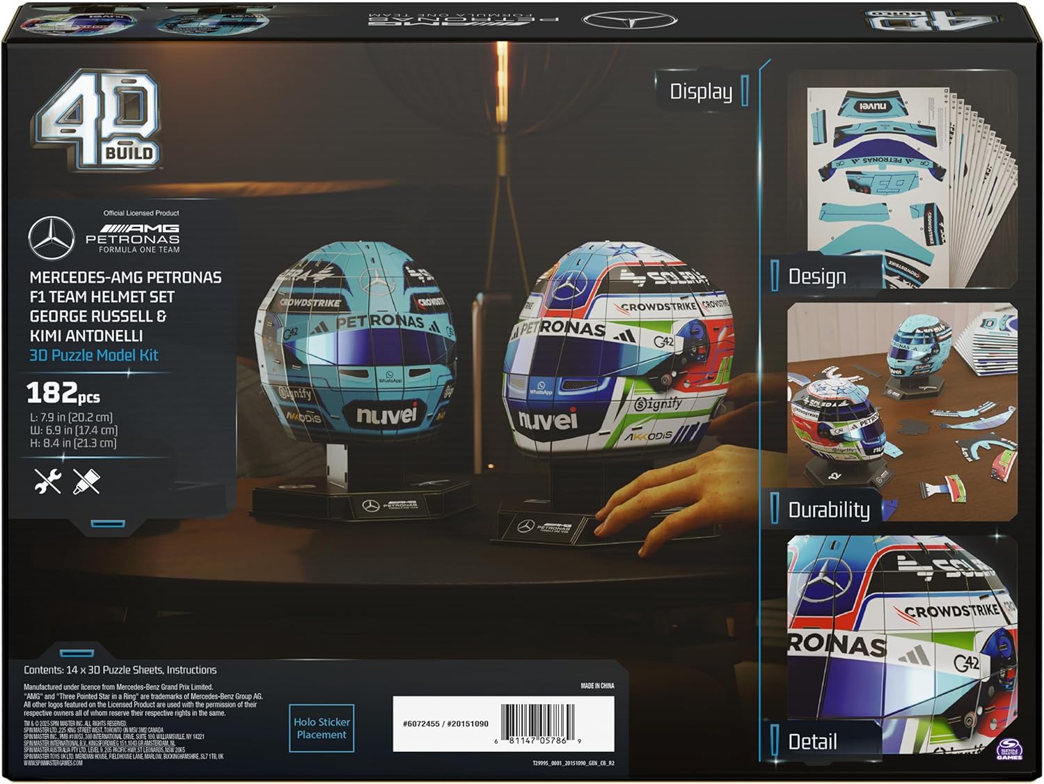 | Subject Character | 4D Build, Mercedes-AMG F1 Helmet Set 3D Puzzle Model Kit with Stands, Russell & Antonelli, Adult Puzzles, Building Toys, 182 Pieces, 3D Puzzles, Gift Ideas for Ages 12 & Up |