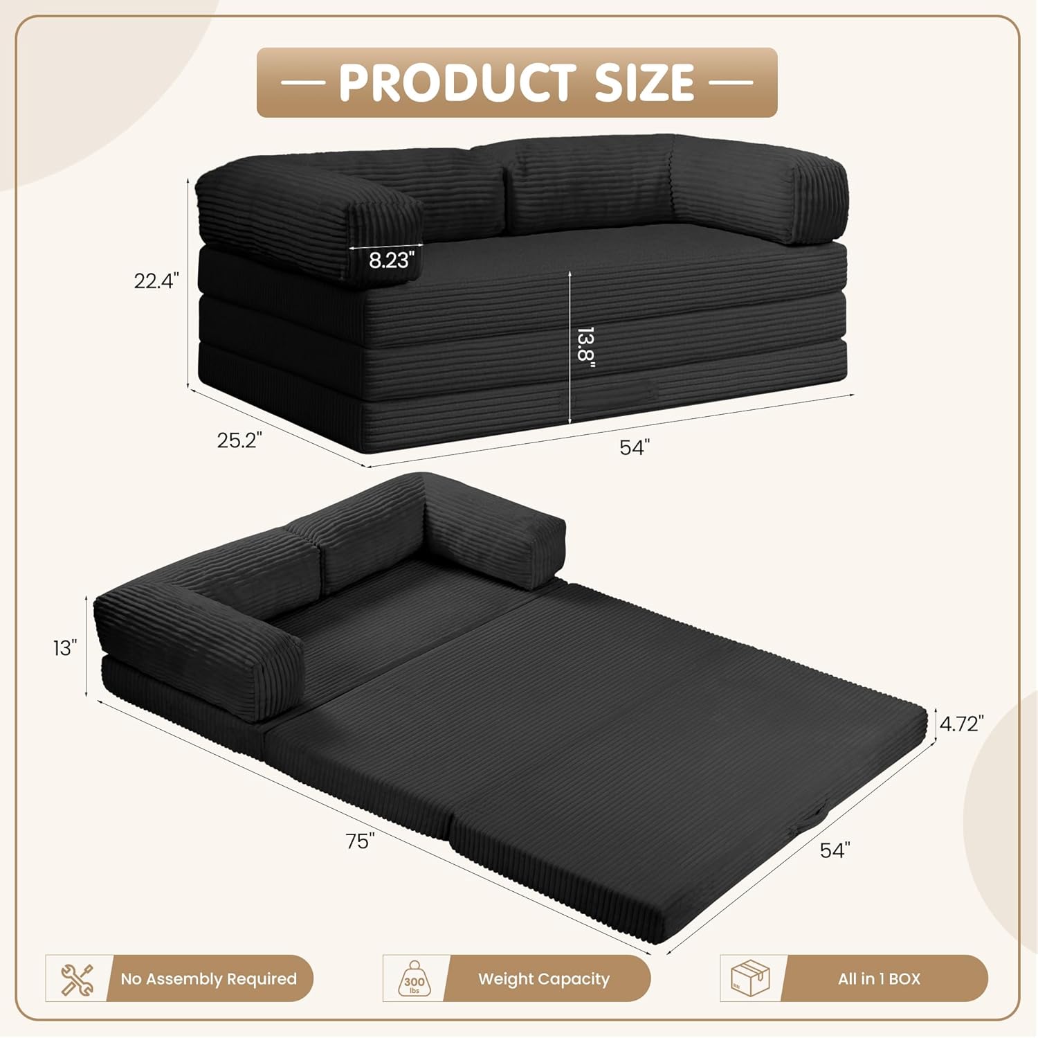 | Additional Features | Convertible, Tri-fold, Couch in a box, No Assembly Needed, Space Saving, Removable L-Shaped Armrest, Machine Washable Cover |