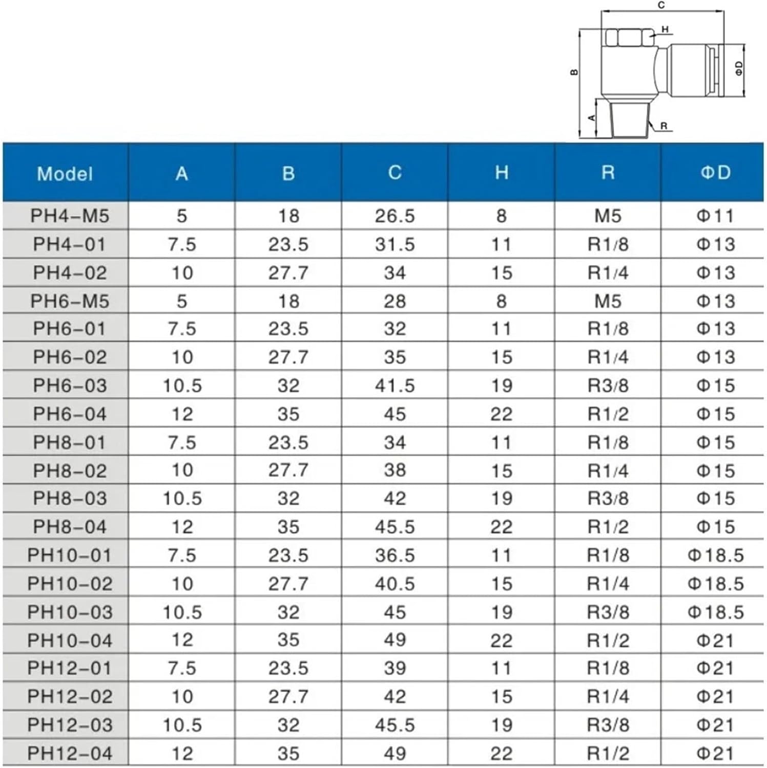 Fittings5 pcs PH Pneumatic Swivel Elbow Air Hose Fitting Connector 4 6 8 10 4mm 6mm 8mm 10mm 12mm Male Thread BSPT R 1/8 1/4 3/8 1/2Specification:Item No.: PLConnection Way: One-Touch Quick ConnectionType: Hose to Male ThreadDesign: ElbowMaterial: Nitrile Rubber, Plasticn , MetalFluid Type: Clean Air, Vacuum, No Toxic GasApplicable Hose: SolfNylon, PolyurethaneNormal Operating Pressure: 0~10kgf/cm² (0~1.0MPa / 0~1.0bar)Max.Operating Pressure: 15.0 bar(1.5MPa)Negative Pressure: -750mmhg (10Torr)Ambient And Fluid Temperature: 0~60 (140)Hose Size OptionsType M M5*0.8 BSPT(R) 1/8 BSPT(R) 1/4 BSPT(R) 3/8 BSPT(R) 1/2 4MM Hose O.D. × 6MM Hose O.D. 8MM Hose O.D. 10MM Hose O.D. × 12MM Hose O.D. × Installation Instructions:InstallationGrasp the tubing and slowly push it into the fitting until it comes to stop. The tubing will be locked by the spring gasket.RemovePush the release button to open the spring gasket so that the tubing can be released.Cautions:1. Cleaning: Clean the piping before connection to remove debris.2. Tubing Cut: Ensure a perpendicular cut without scratches on the tubing's outer diameter.3. Pipe Length: Avoid excessive bending; select a proper pipe length.4. Connection: After connecting, pull the tubing gently to check its seal.5. Release: Push evenly on the release button flange for proper tubing withdrawal.6. Removal: Avoid rotating the tubing fully during removal.7. Assembly: Ensure no debris enters when screwing pipes and fittings together.Safety Instructions:1. Pressure: Ensure zero pressure in the tubing before removal.2. Spatter Zones: Avoid standard fittings in spatter-producing areas.3. Monitor Conditions: Stay within specified pressure and temperature ranges.4. Environment: Avoid corrosive gases,