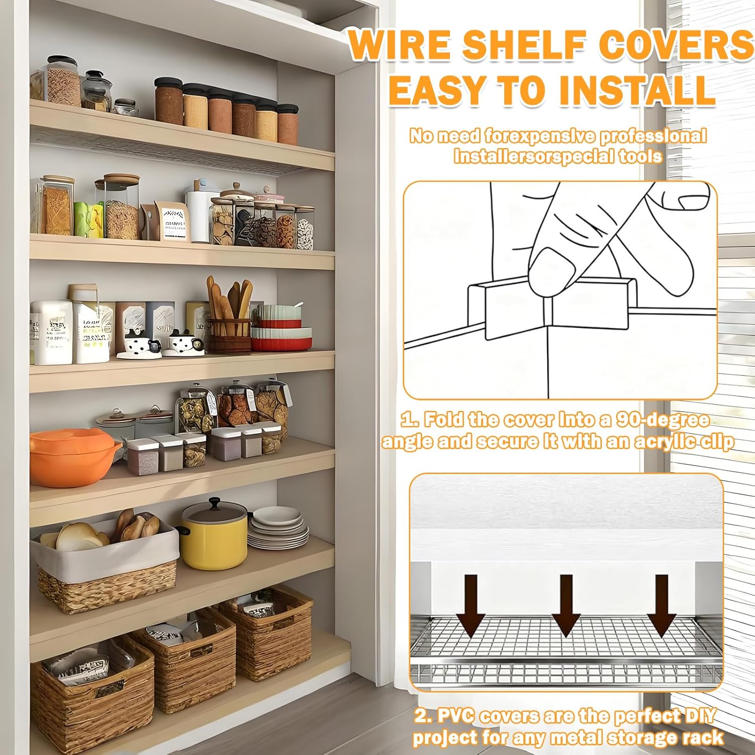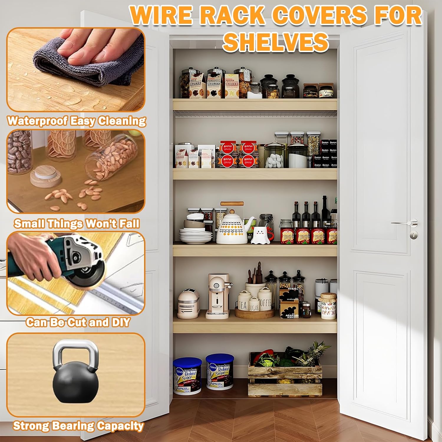 Tired of cluttered, uneven wire shelves? Transform your storage spaces with Wire Shelf Covers—designed to provide a sleek, modern surface while preventing items from slipping through gaps. Perfect for closets, pantries, bathrooms, garages, and offices, these covers instantly elevate your space with a realistic wood grain finish, blending elegance with practicality.Durable & Long-Lasting – Made from high-quality 0.3-inch PVC, these covers are waterproof, moisture-resistant, scratch-proof, and flame-retardant, ensuring they stay looking new for years.Sturdy & Stable Surface – No more wobbling or items falling through! The smooth, flat design provides a secure foundation for clothes, pantry items, tools, and more.Quick & Hassle-Free Installation – Our tool-free, snap-on design makes setup a breeze. The detachable panels allow for easy adjustments, perfect for reorganizing or moving shelves.Easy to Clean & Maintain – The non-adhesive, washable surface resists dust and stains. Simply wipe clean with soap and water for a fresh look.Versatile & Multi-Purpose – Works on all wire shelving units, cabinets, and racks, ideal for kitchens, bathrooms, storage rooms, basements, and offices.Package Includes:5 × Premium PVC Wire Shelf Covers8 × acrylic right-angle holdersNote:1.Before Ordering: Measure your shelves to ensure the best fit!2.Upgrade your storage today—experience the perfect blend of beauty and functionality with Wire Shelf Covers!3.Note: Product is shipped flat to prevent deformation. For any questions, contact us—we’re happy to help!