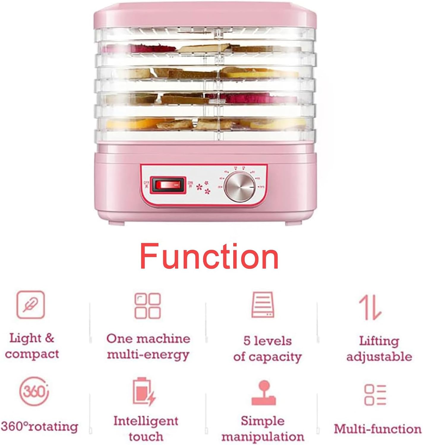 Features:- 5 layers of large capacity- 360° drying- Energy saving- Simple control- 6 functions- 35°C-70°C eight-speed adjustable temperatureSpecification:Product name: Dried fruit machineWeight: 2kgElevated size: 25cm*24.2cm*25.8cmShrink size: 25cm*24.2cm*18.7cmColor: pinkCapacity: 5 layersRated voltage: 220VRated power: 250WRated frequency: 50HzPackage includes:1 x Food Dehydrator1 x Manual