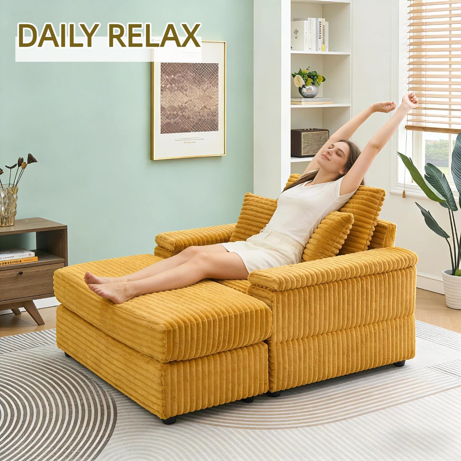 Relax in style with this 43” oversized sofa chair couch, a single one-seater sofa with ottoman designed for comfort and versatility. Wrapped in soft, durable corduroy fabric with thick foam cushions, it provides a cozy seating experience. The movable ottoman transforms the chair into an oversized lounge accent chair or a chaise lounge, and can also serve as a footrest, small table, or extra seat. Built with a sturdy wooden frame, it supports up to 500lbs, perfect for reading, working, or entertaining. Ideal for small apartments, bedrooms, living rooms, offices, or study rooms, it combines modern design with space-saving functionality. Includes two removable throw pillows, stain-resistant interior, and easy assembly with all hardware and instructions included. Dimensions: 43.3"L x 55.1"W x 30.7"H.