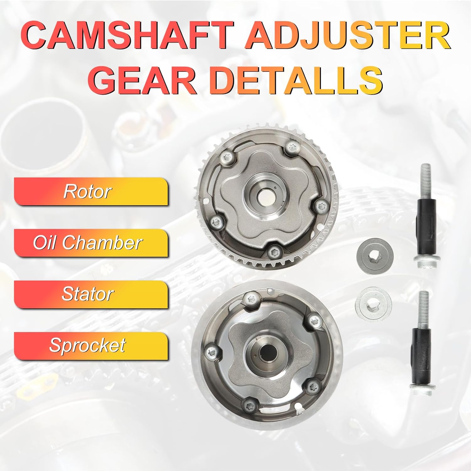 The Engine Timing Sprocket Gear Part Number:55567048 55567049 This Camshaft Phaser Adjuster Replacement With: For Chevy: Fits for 2010-2011 Aveo 1.6L Fits for 2010-2011 Aveo5 1.6L Fits for 2011-2015 Cruze 1.8L Fits for 2016 Cruze Limited 1.8L Fits for 2012-2017 Sonic 1.6/1.8L For Pontiac: Fits for 2010 G3 1.6L Package includes: Intake Exhaust Timing Camshaft Sprocket*2 Our Camshaft Adjuster Gear Product Features: (1)Stable performance, high reliability. (2)High-temperature resistant, long service life. (3)Easy to install, fast response. (4)Made of high-quality metal materials, safe and reliable. (5)Complete accessories, strong performance.