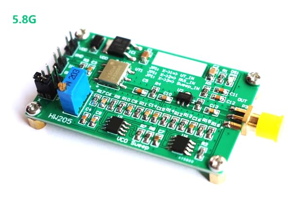 5.8GHz VCO signal generator HW205 VCO generator module with sweep power 1.1 Module parameters Parameter unit Output frequency range 5725~5850 MHz Output frequency range 2300~2485 MHz Maximum output amplitude <15dBm dBm Working voltage 7~12 V Size 60*35 mm Weight: 12 g 2.0 P1 interface: VDD: positive power supply; GND: negative pole of power supply; P2 interface: VT_IN: Input tuning voltage (VCO) signal (0~9V). GND: The negative pole of the power supply. P3 interface: output signal. (RP SMA KE KHD outer screw inner hole) JP1 jumper: select external or internal (potentiometer) or sweep frequency input tuning voltage, JP1: x->1 => VT_IN; JP1: x->2 => RV1_IN; JP1: x->3 => Sweep_IN; RV1: Internal (potentiometer) input tuning voltage; The sweep frequency is about 30KHz