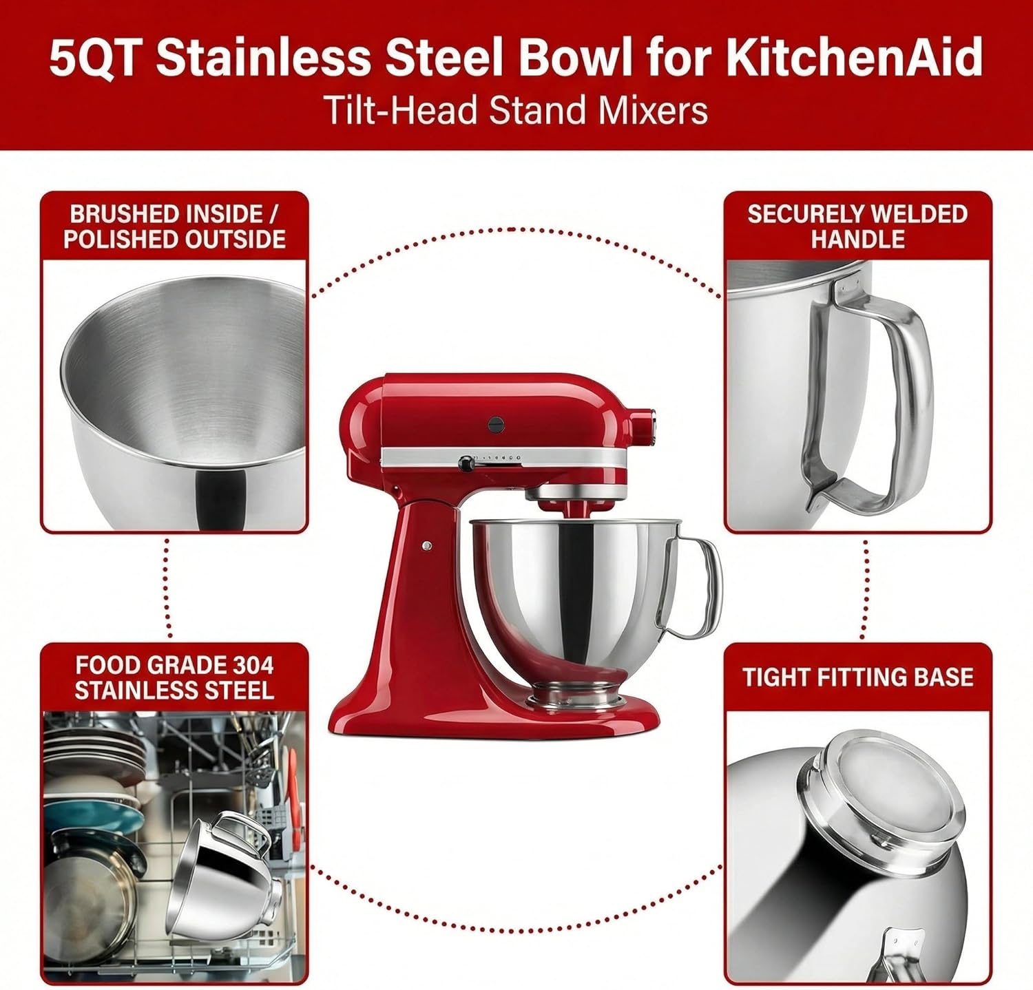 Upgrade your mixing setup with a durable, easy-to-use 5-quart stainless steel mixer bowl designed for 4.5–5QT tilt-head stand mixers. Featuring an ergonomic handle and a lightweight build, it’s easier to lift, scrape, and pour—perfect for everyday home baking. Made from food-grade 304 stainless steel, this bowl resists rust and scratches while staying strong for long-term use. When you’re done mixing, simply wash with warm soapy water or place it in the dishwasher for quick cleanup. Highlights: 5 QT capacity for most daily recipes Comfort handle for better grip and pouring Lightweight design for easier handling 304 stainless steel: durable & food-safe Dishwasher safe for easy cleaning Fit Guide (match by mixer model code): Fits tilt-head 4.5–5QT mixer model codes including K45SS / KSM75 / KSM90 / KSM100 / KSM150. Please verify your mixer’s model code and bowl-lock base style to ensure compatibility.