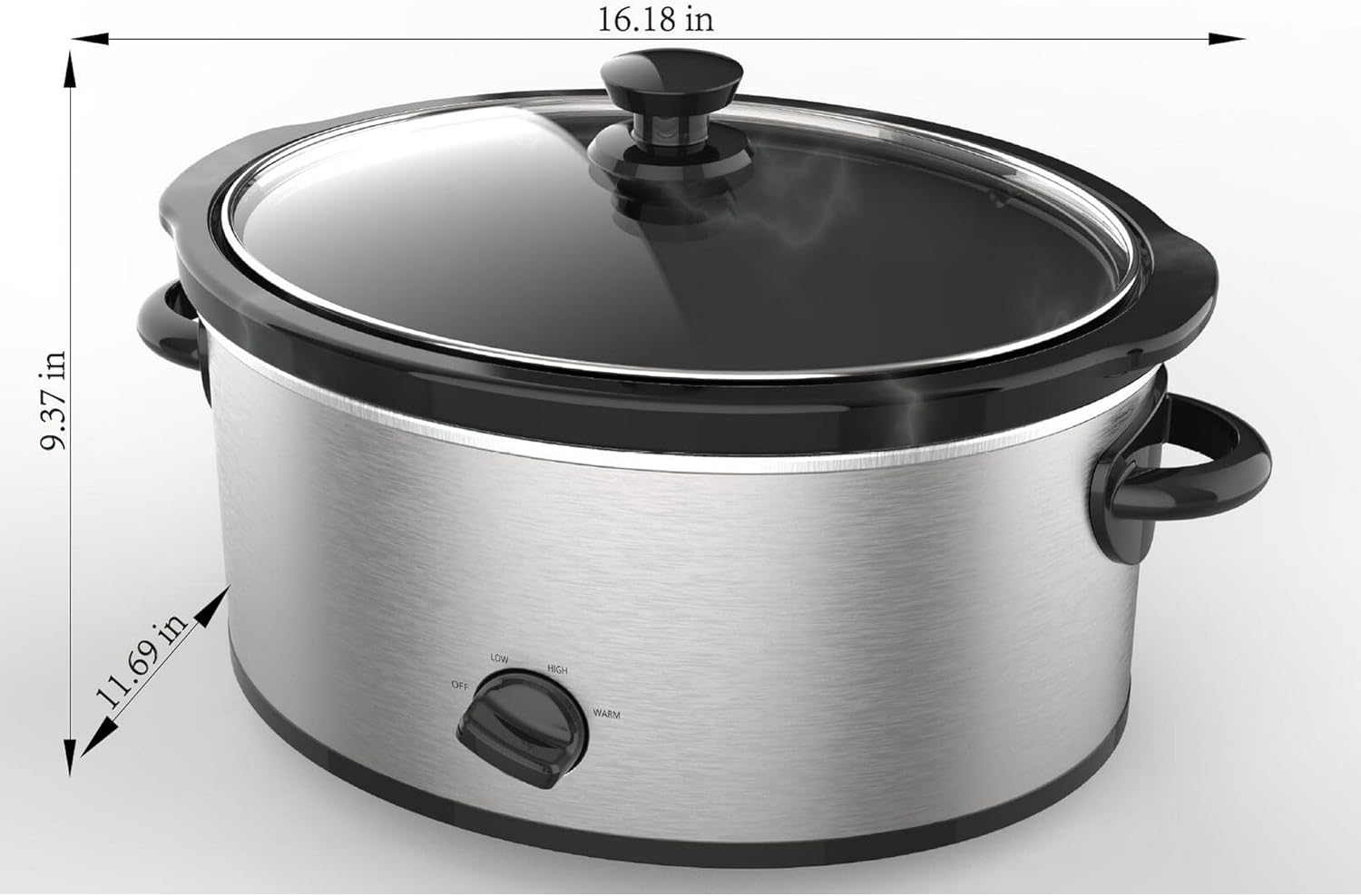 6 Quart Oval Slow Cooker, Stainless Steel Finish, Glass Lid, Adjustable Temp, Perfect for Families and Gatherings Entertaining, Silver