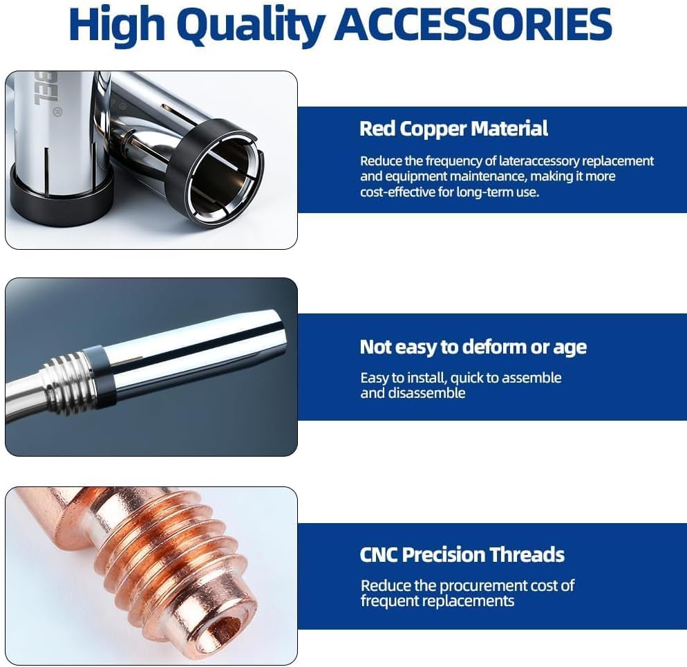 | Included Components | Includes 40 extra‑thick contact tips (10 each of 0.030"/0.040"/0.045"/0.055"), 5 gas nozzles, and 5 diffusers – complete 24KD consumables set on Amazon. Maximize uptime with fewer changeouts. |