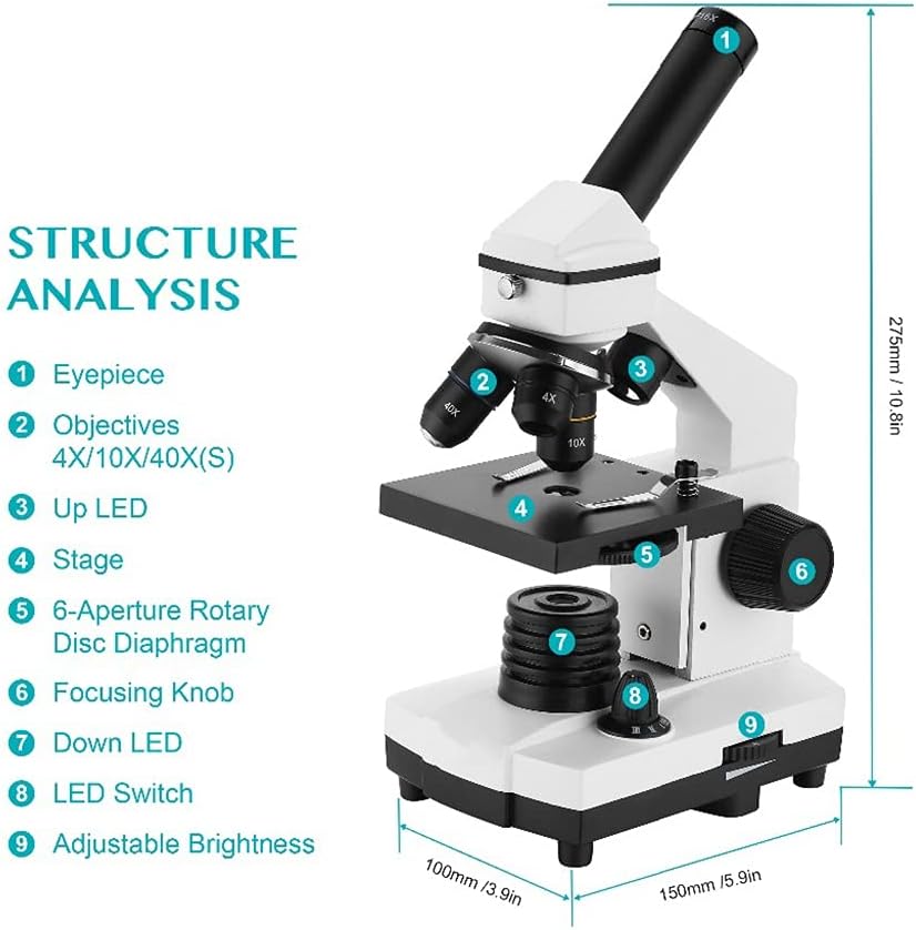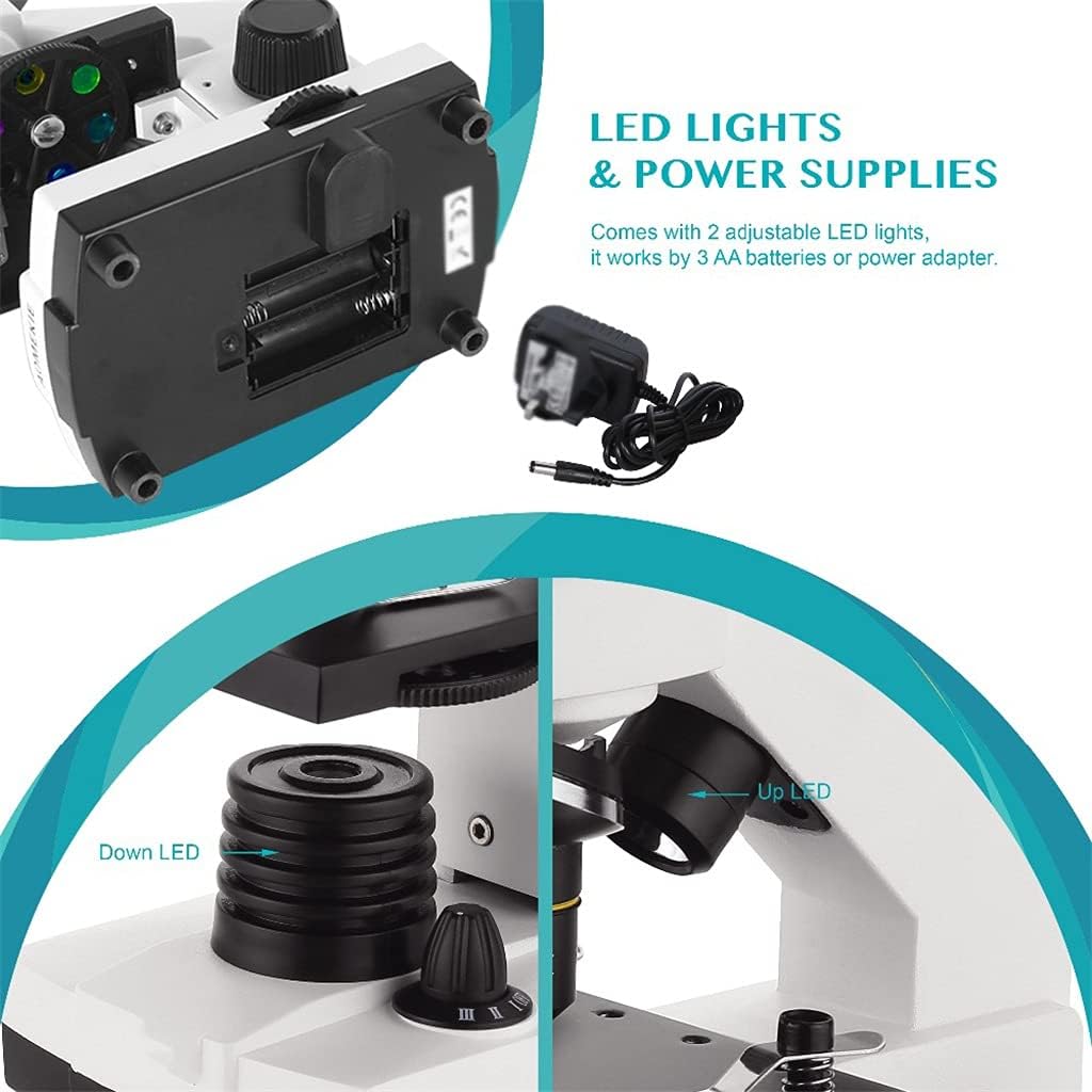A Great Affordable High Power Student Microscope.45 Degree Inclined 360 Degree Swiveling Monocular with Locked-in Eyepiece.Up and down LEDs Illumination System.Plain Stage with Clips and Stain Resistant Finish.Fully Coated Optical System, High Resolution Offering Sharp Images.Specification: Eyepieces: WF16X, with wide filed of view.Achromatic objective lens: 3 lens in metal barrels, built with optical glass with 4x, 10x and 40x power; 360 degree rotatable, and 45 degree inclined for convenient observation with comfortable posture.Magnification:64x,160x,640xMetal body and system: for frequent use either in a school laboratory or at home.Illumination: top and bottom LED lights which are mains powered.Light brightness adjustment.Disk diaphragm: with 6 colour filter.Power supply 1: 110V~230VPower supply 2: 3 AA batteries(not include in the package)Package Included:microscope*1If you have any questions about the product, please me, we will you within 24 hours and give you a satisfactory answer.Supports memory card insertion for taking photos and videos