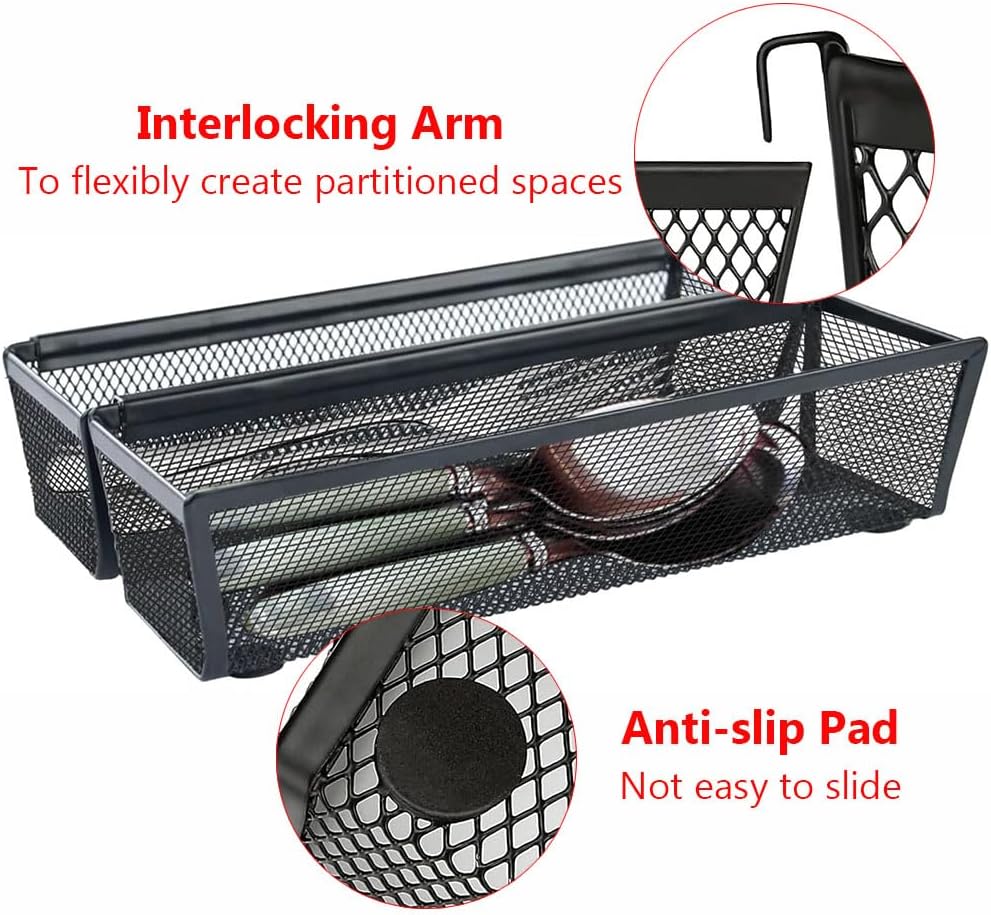 Feature:【Iron Material】This drawer organizer is made of iron, providing stable support performance. It is not easily deformed or broken, maintaining consistent shape during long-term use and extending its service life.【Non-Slip Pad Design】The bottom is equipped with non-slip pads, enhancing friction with the drawer surface or countertop. This effectively prevents sliding or shifting during use, improving placement stability.【Mesh Design】Our utensil organizer features a mesh design, allowing clear categorization of cutlery such as forks and spoons, preventing mixing and optimizing the utilization of drawer space. The clean lines and metallic texture blend into various kitchen styles, balancing visual order and practical convenience.【Flexible Interlocking】The storage box is designed with interlocking arms, allowing users to freely adjust the combination according to the drawer size, flexibly creating partitioned spaces. You can adjust its orientation to divide different areas.【Wide Application】This mesh drawer organizer with interlocking arm is suitable for various scenarios. In addition to organizing kitchen utensils, it can also be used in multiple settings such as desks, wardrobes, bathroom shelves, or countertops, enabling orderly categorization of items. Its compact shape saves space, while the modular design meets diverse storage needs and improves space utilization efficiency.Specification:Name: Drawer OrganizerMaterial: IronColor: BlackSize: 24.51*7.62*5.08cm / 9.65*3*2inPackage Included: 6 * Drawer Organizers