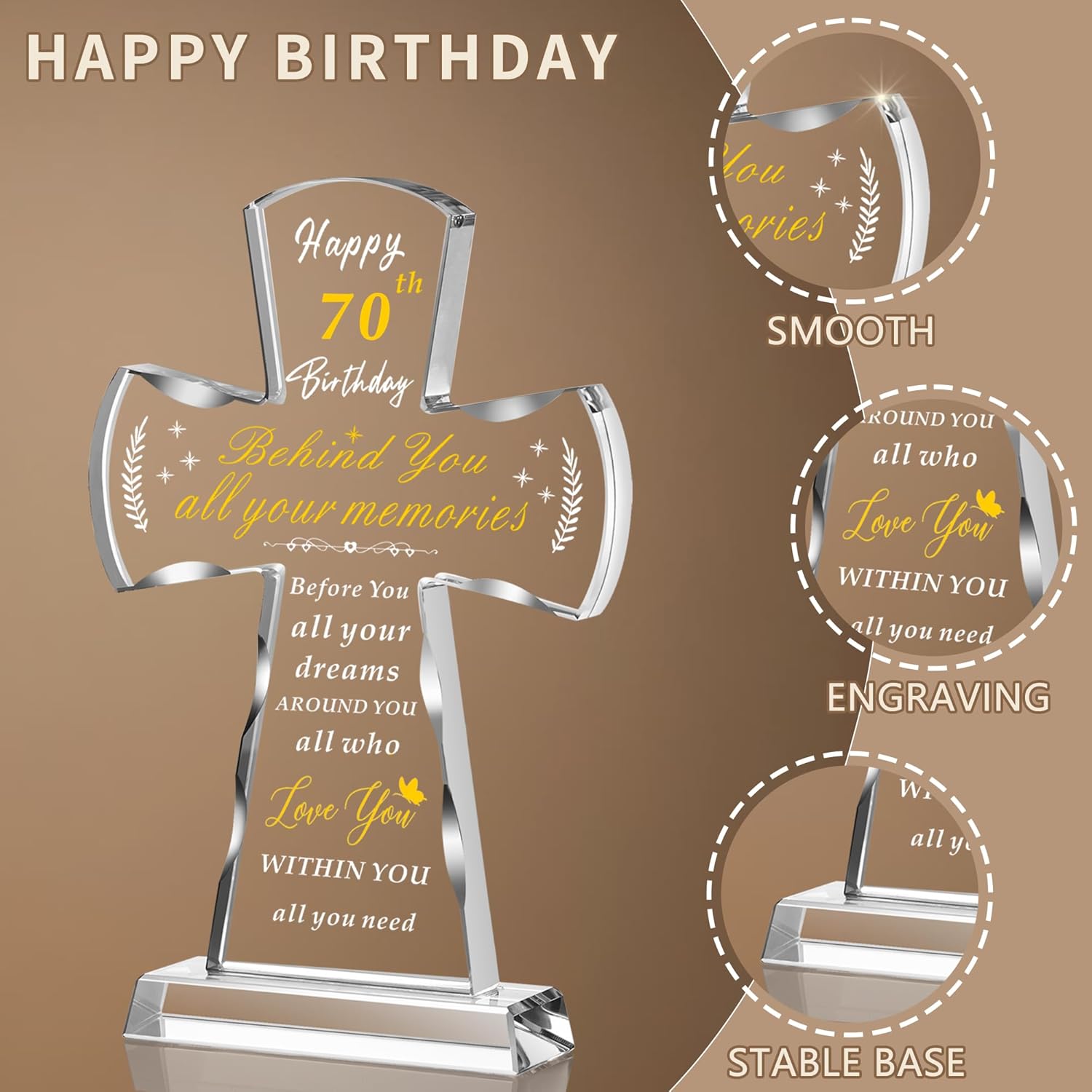 A Treasured Keepsake for the Golden 70th Birthday CelebrationMarking a half-century of life is a momentous occasion that calls for a gift as special as the person you're honoring. Our beautifully crafted glass cross, elegantly engraved with "Happy 70th & Fabulous Birthday," offers a timeless and uplifting way to celebrate this remarkable milestone. Measuring 5.12 x 8.05 inches, it strikes the perfect balance between presence and elegance, making it a tasteful accent piece for any room or workspace.Expertly hand-cut and polished from high-quality glass, this cross showcases delicate multi-facet edges that catch and reflect light beautifully, adding a subtle sparkle to your decor. The deeply engraved inspirational message—"Behind you, all your memories. Before you, all your dreams. Around you, all who love you. Within you, all you need"—is permanent and designed to last a lifetime, serving as a daily reminder of love, support, and inner strength.This cross comes complete with a matching stand, allowing for easy, elegant display with no assembly required. It’s an ideal gift for a loved one—be it your mom, dad, best friend, or spouse—and is thoughtfully packaged in a stylish gift box with a blank greeting card and cleaning cloth, ready to present with love on this unforgettable birthday. More than just a decoration, it’s a keepsake of faith, love, and beautiful new beginnings.