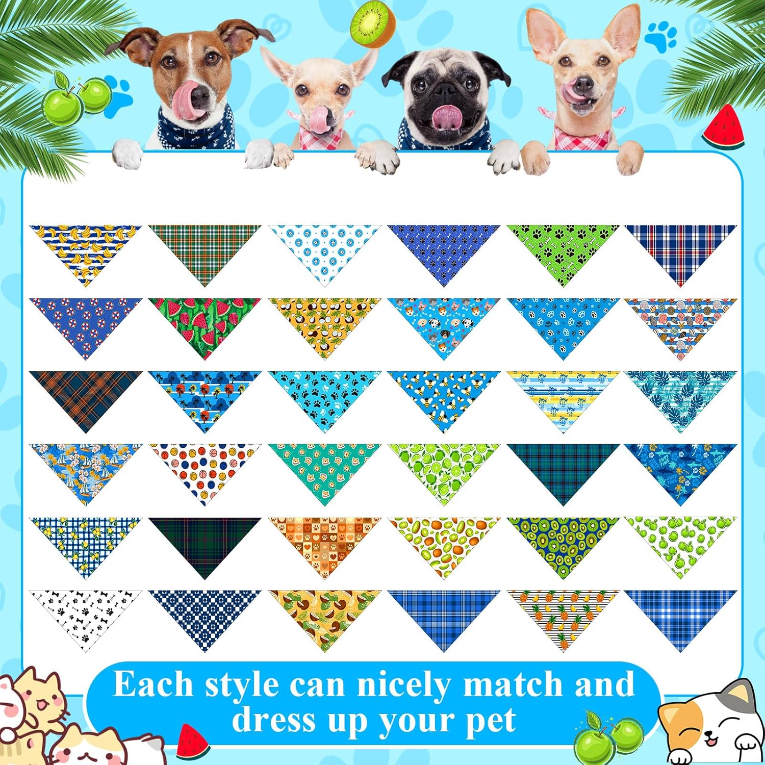 Features: These dog bandanas are made from polyester fabric, both soft and comfortable for your pets. This breathable and lightweight material keeps your pet feeling at ease, making it suitable for daily wear. The fabric is also washable, allowing for easy cleaning after outdoor adventures or playtime. With a range of adorable pattern, They can be easily matched with different outfits, Whether for casual outings or special events, capturing attention and admiration wherever they go. Specifications: Material: Polyester fabric Color: Multicolor Size: approx. 22.83 x 16.14 x 16.14 inches/ 58 x 41 x 41 cm Package includes: 72 X Dog Bandana Notes: Manual measurement. Please allow slight errors on size. The color may exist with a slight difference due to different screen displays.