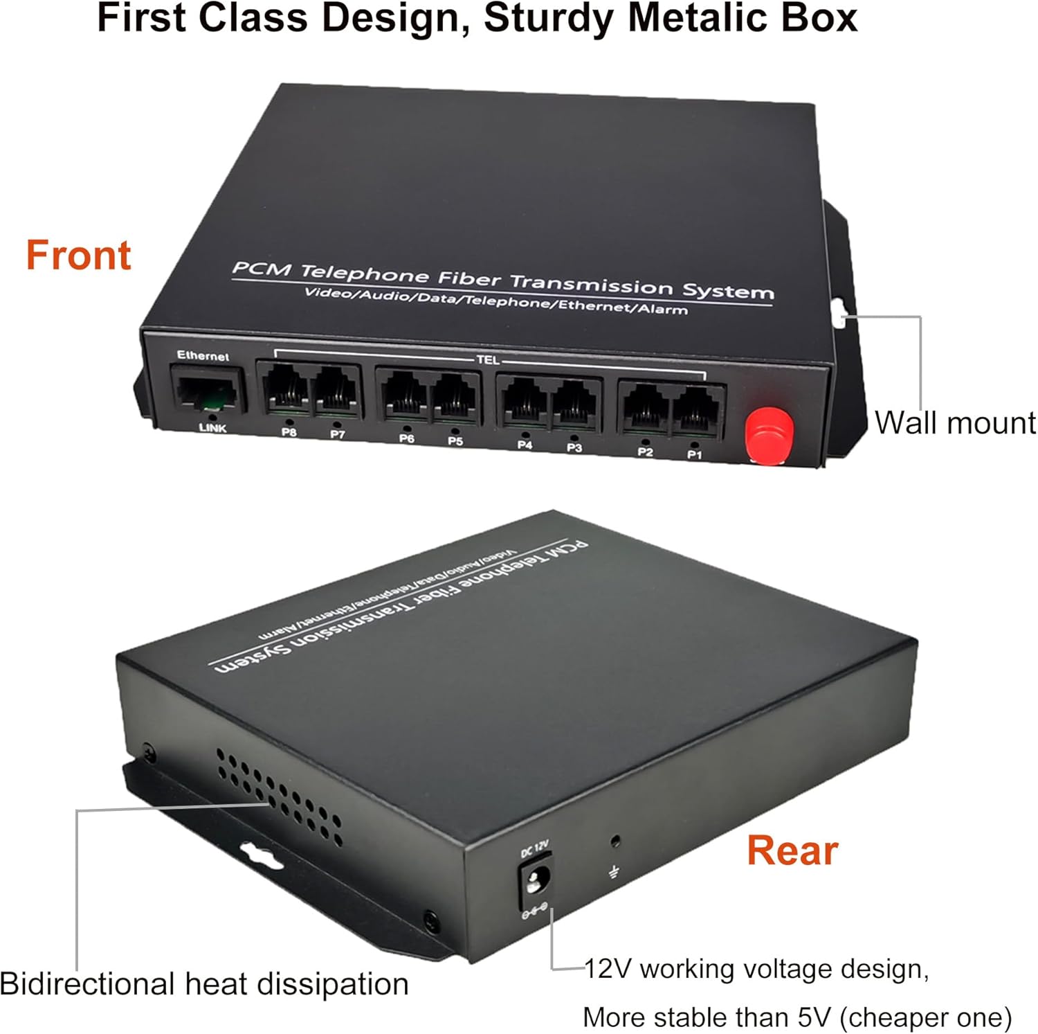 Phone RJ11 port specifications: FXS interface (transmitter) Telephone Channel: 8 Ringing receiving voltage: 75V (AC) Ring frequency: 25Hz or 50Hz Two-wire input impedance: 600Ω FXO interface (receiver) Telephone Channel: 8 Ring output voltage: 75V (AC) Ring frequency: 50Hz Two-wire input impedance: 600Ω Optical interface: FC/UPC Ethernet RJ45 port specifications: Rate: 10M/100Mbps, full duplex, half duplex fully adaptive Protocol: IEEE802.3 10Base-T Ethernet , IEEE802.3u. 100Base-TX/FX Fast Ethernet , IEEE802.3x Flow control , IEEE802.1q VLAN,IEEE802.1p Qos,IEEE802.1d Spanning Tree Physical interface: RJ45, support AUTO-MDIX (cross line straight line adaptive) Power supply: 1. Suitable working voltage AC100~240V, DC12V 2. US/EU/UK/AU standard power supply adaptor is optional. Other index Working temperature -20°C ~70°C Storage temperature -40°C ~85°C MTBF >100,000hours Package include: 1. 1x 8 channel POTS telephone Transmitter 2. 1x 8 channel POTS telephone Receiver 3. 1x FREE 3m FC-FC Fiber patch cord 4. 2 x External US standard power adapter 5. User Manual