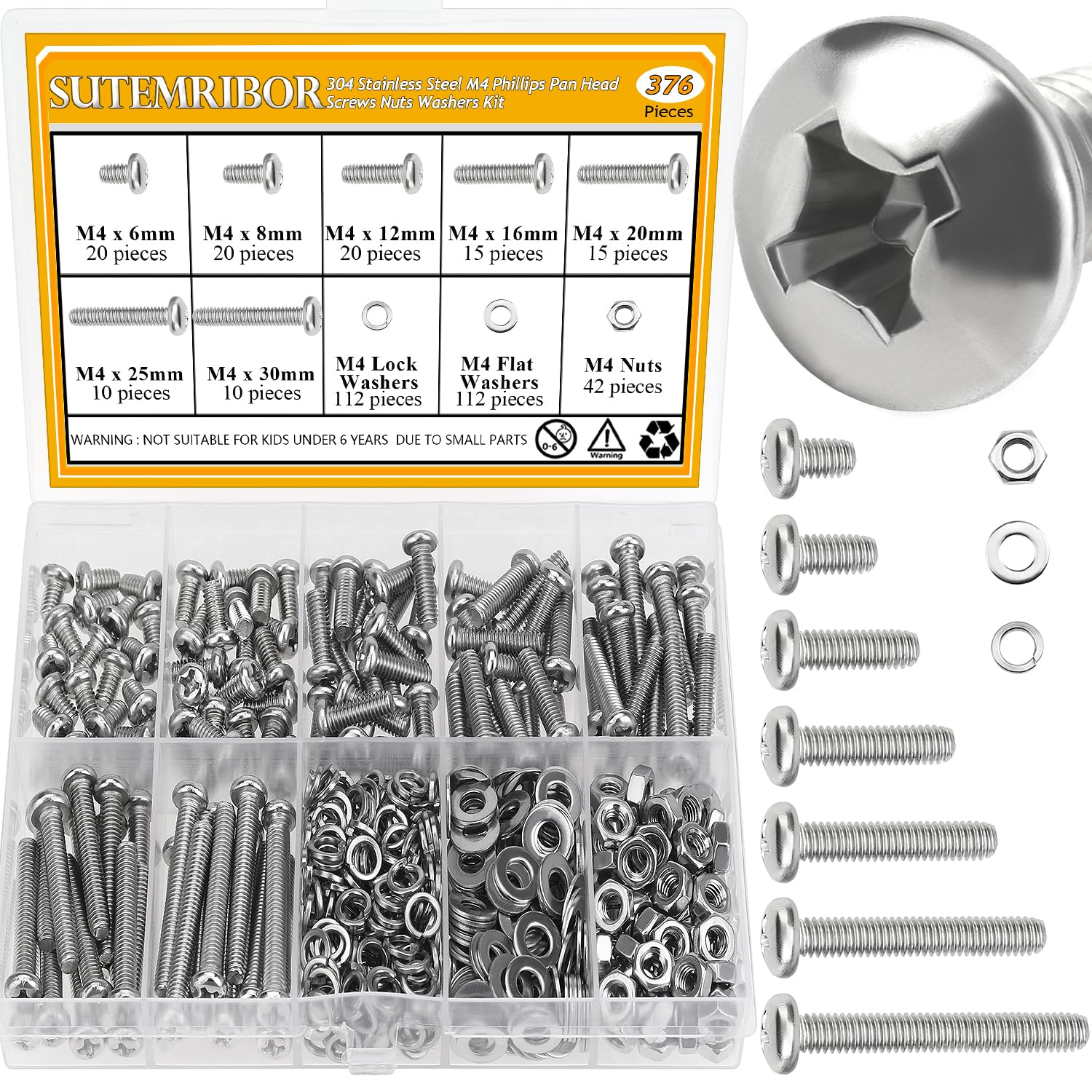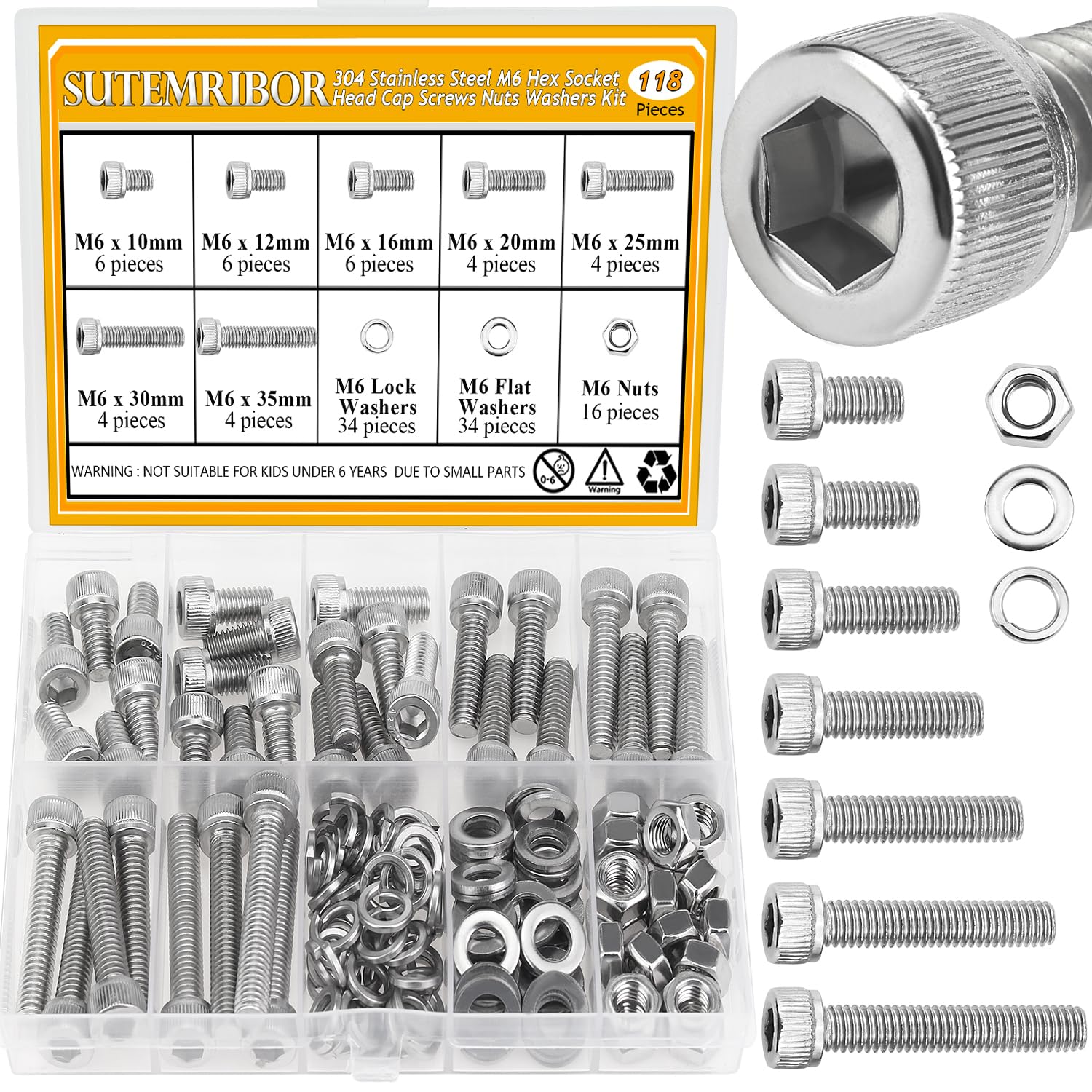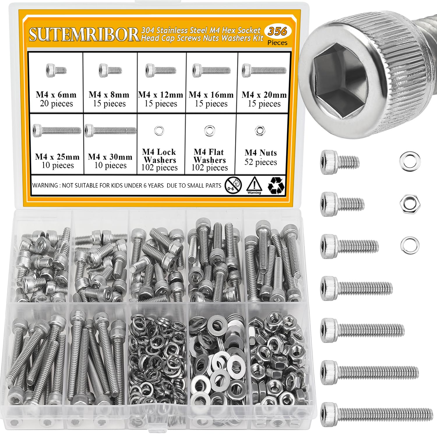 Specifications: - Color: Silver - Quantity: 815 Pieces - Sizes: M3 M4 M5 M6 - Drive Type: Internal Hex - Material: 304 Stainless Steel - Screw Type: Button Head Socket Cap Screws Feature: 1, High quality 304 stainless steel have high strength, not easy to deform, corrosion resistance and rust resistance in bad environment, which can ensure a long time using. 2, Sutemribor M3 M4 M5 M6 screws nuts washers are well made, with smooth surface, which are commonly used in machinery, it mainly has the advantages of easy fastening, disassembly, and not easy to slip corners. 3, Widely used for precision machinery industry, classified instruments, instruments, electronic products, printed projects, household appliances, communication products, locks, lamps, lights, toys, etc. Package includes: 20 Pieces M3x8mm 20 Pieces M3x12mm 20 Pieces M3x16mm 20 Pieces M3x20mm 91 Pieces M3 Hex Nuts 91 Pieces M3 Flat Washers 20 Pieces M4x8mm 20 Pieces M4x12mm 20 Pieces M4x16mm 20 Pieces M4x20mm 90 Pieces M4 Hex Nuts 91 Pieces M4 Flat Washers 15 Pieces M5x8mm 15 Pieces M5x12mm 10 Pieces M5x16mm 10 Pieces M5x20mm 50 Pieces M5 Hex Nuts 61 Pieces M5 Flat Washers 10 Pieces M6x8mm 10 Pieces M6x12mm 10 Pieces M6x16mm 10 Pieces M6x20mm 40 Pieces M6 Hex Nuts 51 Pieces M6 Flat Washers 4 Pieces Hex Wrenches Note: the product are small parts, keep away from children and kids