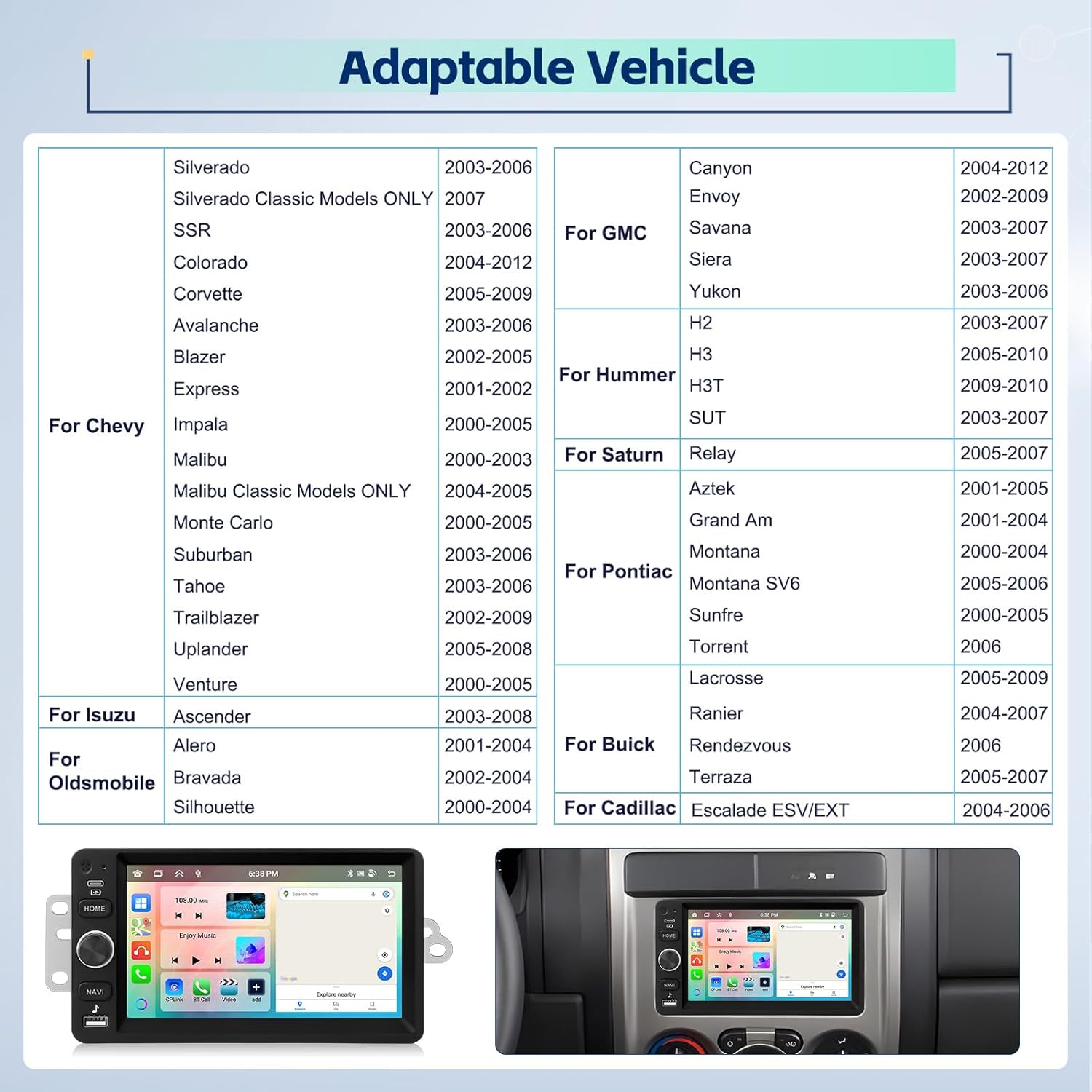 | Compatible with Vehicle Type | for Chevy Chevrolet GMC Hummer |