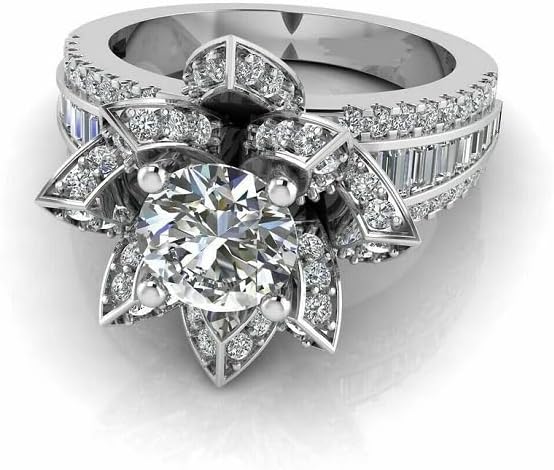 925 Sterling Silver Baguette & Round Cut White Diamond Lotus Flower Engagement Wedding Ring for Women's In 14K White Gold Finish