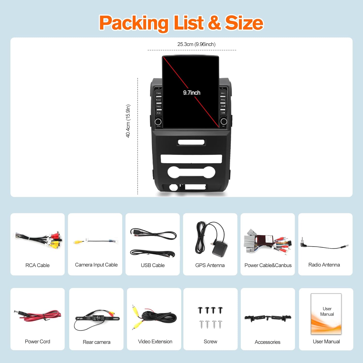 Applicable Car Models: Transform Your Ford F150 (2009-2014) Driving Experience with the Ultimate 9.7" Android 13 Smart Radio.The high-resolution 9.7-inch touchscreen ensures clear visuals, fast response, and easy operation, making every interaction intuitive and enjoyable. Perfect Fit & Easy Installation - This unit is custom-designed for the Ford F150 2009-2014 dashboard. The sleek design matches your interior trim, giving your vehicle a modern, high-end feel. Blazing-Fast Performance with Android 13 - Step into the future with the very latest Android 13 operating system. Coupled with the powerful 4GB RAM and 64GB internal storage, this stereo runs thousands of apps from the Play Store effortlessly. 4GB RAM - Ensures seamless multitasking and lag-free operation between Google Maps, Spotify, and other apps. 64GB ROM - Provides ample space for offline maps, music downloads, and applications, reducing the need for external storage. Seamless Smartphone Integration - Stay connected while keeping your eyes on the road with both Wireless and Wired Apple CarPlay & Android Auto. Access your favorite playlists, get directions via Apple Maps or Google Maps, send messages, and make calls—all through the intuitive voice control system. Advanced GPS Navigation - The built-in GPS module supports high-precision positioning. Use popular navigation apps like Waze, Google Maps, or Sygic. The large 9.7-inch screen provides crystal-clear map views, making complex intersections easy to navigate. Premium Audio & Entertainment - Transform your cabin into a concert hall. The stereo supports a wide range of audio formats (MP3, WMA, FLAC, etc.) and video formats (MP4, AVI, MKV, etc.). Dual-Band WiFi - Supports 2.4G/5G WiFi networks for faster internet speeds and smoother online video streaming. USB Ports - Charge your devices and play media directly from USB drives. Backup Camera Ready - Parking your F150 becomes effortless. The system supports connecting a backup camera (camera included). As soon as you shift into reverse gear, the screen automatically displays a live, clear view of what's behind you, complete with parking guidelines. Steering Wheel Control - Retain the functionality of your factory steering wheel buttons DSP Function - Digital Signal Processing allows you to fine-tune the sound to your exact preference, adjusting bass, treble, and equalizer settings for the perfect acoustic environment.