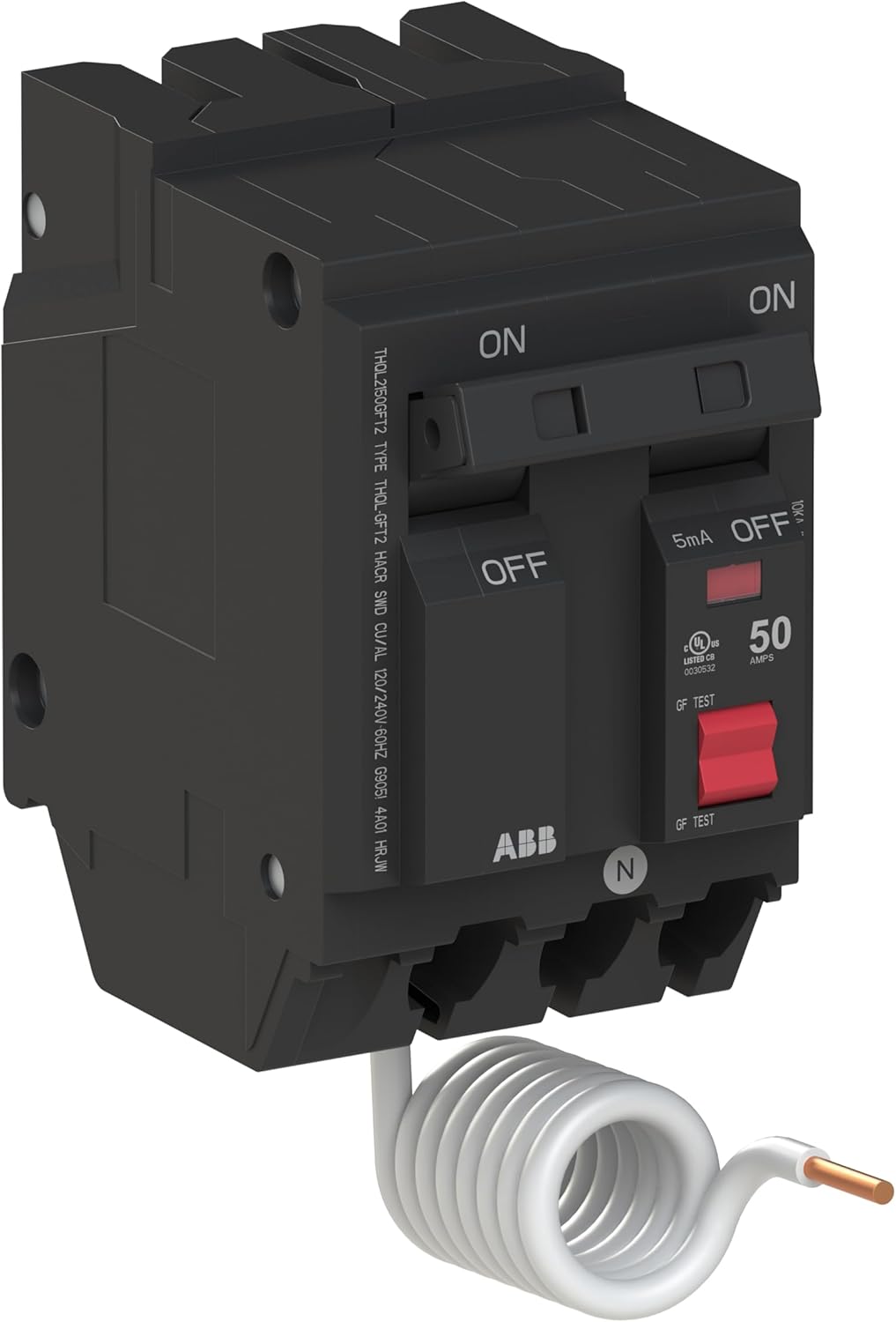 ABB's THQL2150GFT2A is a ground fault circuit breaker (GFCI) designed for residential and commercial applications. It meets NEMA standards, is ANSI certified, and is CSA and UL listed.This double pole, double space, plug-on circuit breaker is rated 50A at 120/240 VAC with a 10 kAIC interrupting rating. The breaker trips to the center position. The tin-plated copper stabs create a corrosion resistant connection. The breaker case is made of heat resistant thermoset for structural integrity.ABB's THQL2150GFT2A replaced GE's THQL2150GFT2 breaker. GE residential electrial products are now branded ABB. ABB is a global leader with over 100 years of electrical expertise, innovation, and pioneering technology.