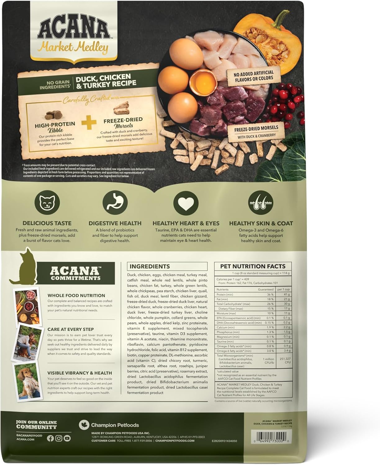 | Breed Recommendation | ACANA Market Medley Duck, Chicken and Turkey Recipe Complete Cat Food is formulated to meet the nutritional levels established by the AAFCO Cat Food Nutrient Profiles for All Life Stages. |