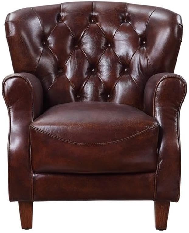 The accent chair invites you to sit back and relax for hours on end. A timeless design, this armchair features vintage brown top-grain leather upholstery with button-tufted accents, rolled arms, and tapered wood legs. Whether your decor leans traditional or transitional, or even modern eclectic, the tasteful style of this unusual piece will be perfect for any room.
