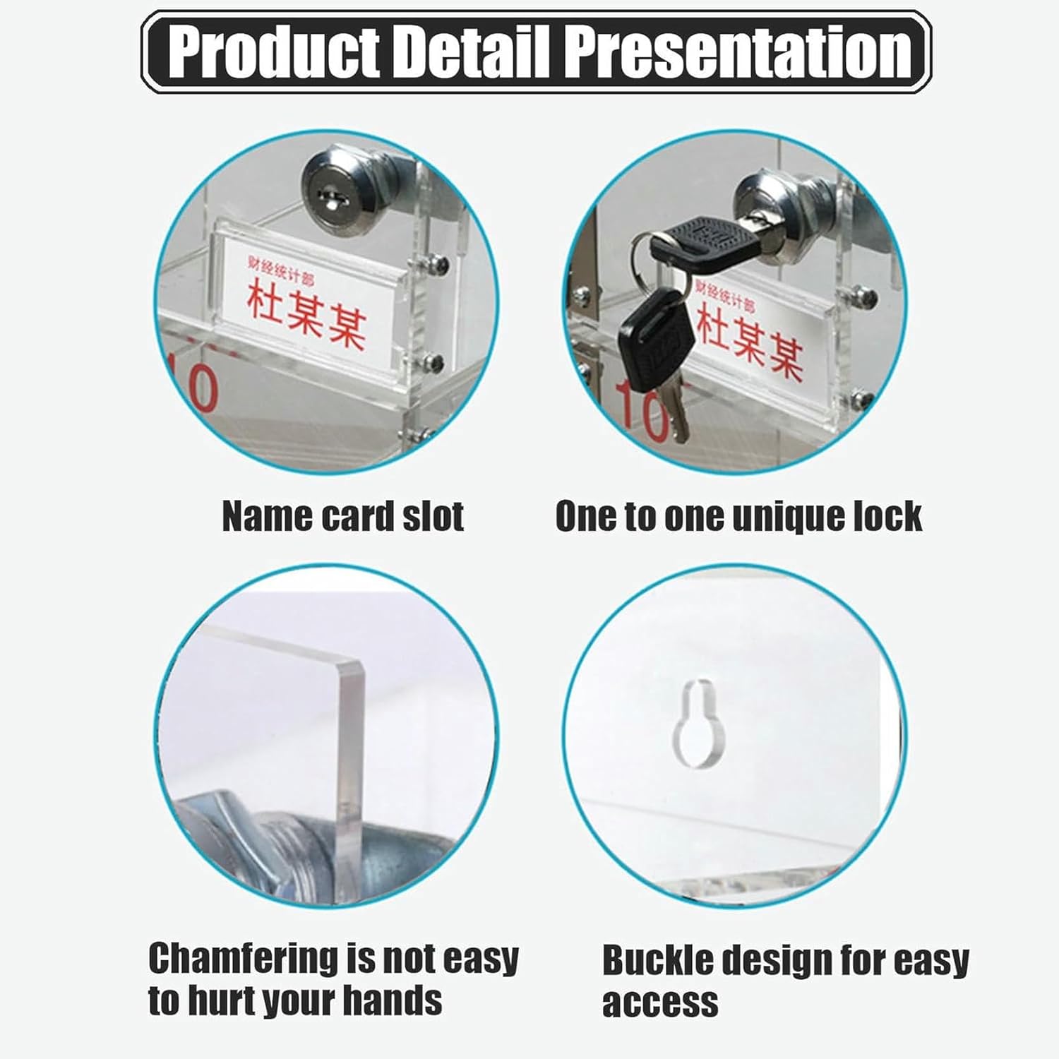 Introducing our innovative Clear Cell Phone Locker Box, designed to enhance your organization while providing a sleek, modern touch to any space. Ideal for offices, schools, or events, this locker box offers a secure and stylish solution for storing personal devices, ensuring that they remain safe and out of the way during important meetings or classes.Each slot features a unique digital code, simplifying the management and retrieval of items. No more searching for misplaced keys or devices—our coded system keeps everything organized and easily accessible.Equipped with a durable coil, this product allows you to hang and carry your keys effortlessly, reducing the risk of loss. Whether you're at work or hosting an event, you can trust that your keys will always be within reach.Specifications:- Color: Clear- Material: Acrylic- Style: Modern- Number of Slots: Available in 6, 9, 12, 15, 20, 25, or 30 slots- Installation: Screw-in, suitable for wall mount or freestanding usePackage Includes:1 x Clear Cell Phone Locker BoxPlease note that slight color variations may occur due to lighting, and allow for minor measurement discrepancies. Ensure you’re comfortable with these details before making your purchase.