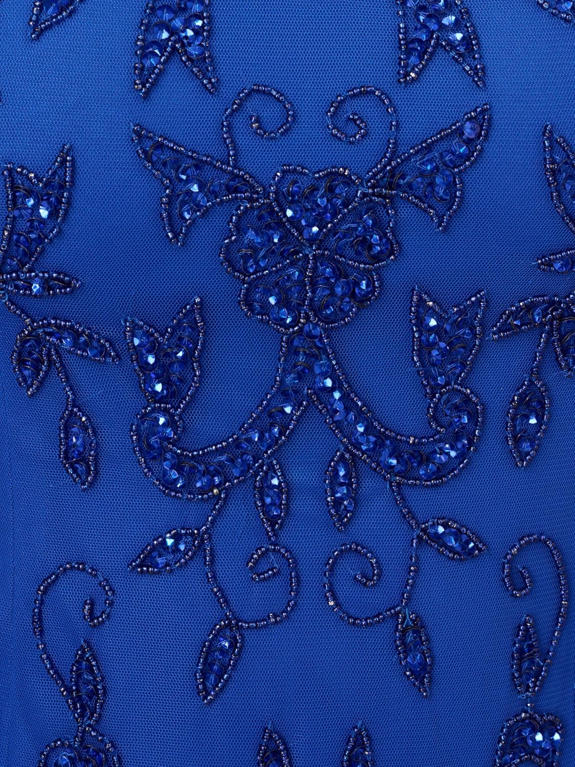 Flourishing details set off this beaded gown. This formal dress features an unlined circle neckline and short sleeves, a fitted silhouette, and a godet pleat skirt. Lined through the body with a sweetheart neckline and tank strap lining, this gown boasts a mesh overlay covered inbead and sequin embroidered flowers in figure-flattering patterns. This evening gown has no waist seam for an easy fit and a zipper back closure. A sheer back and keyhole with hook-and-eye closure complete this beaded gown. Add neutral heels and a metallic clutch to this short sleeve gown for an eye-catching look at your next black-tie event.