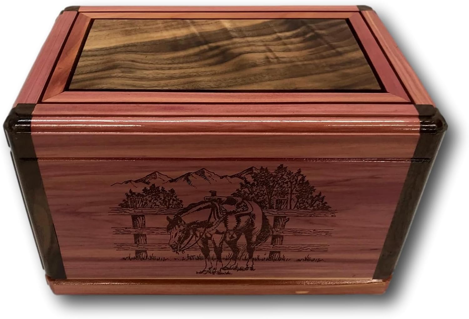 Honor the spirit of the American West with this Riderless Horse Cremation Urn, a powerful symbol of loyalty and remembrance. Handcrafted from Red Cedar and Walnut hardwoods, each urn features a finely engraved riderless horse design — a timeless tribute to those who lived with strength, courage, and grace. Every piece is made in Montana using traditional woodworking methods that highlight the natural beauty of the wood. With its secure bottom-opening design and professional lacquer finish, this urn serves as a dignified memorial for your loved one. Features: Handcrafted in Montana, USA Premium Red Cedar and Walnut construction Riderless horse and mountain scene engraving Smooth satin lacquer finish Secure bottom-opening with screws Platform base for stability Natural wood grain with two-tone contrast Protective interior lining Optional custom engraving available Dimensions: Exterior: 10"L x 6.5"W x 6.5"H Capacity: 192 cubic inches (suitable for adults up to 190 lbs)