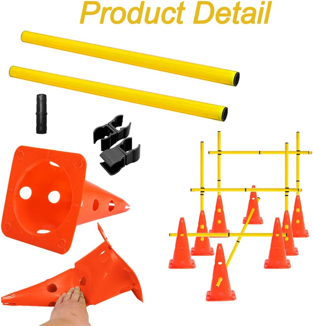 Product specificationProduct type: Hurdles trainning setMaterial: ABS plasticProduct color: as the picture shownProduct size: as the picture shownPackage contents:12 x agillity poles8 x roating clips8 x training cones