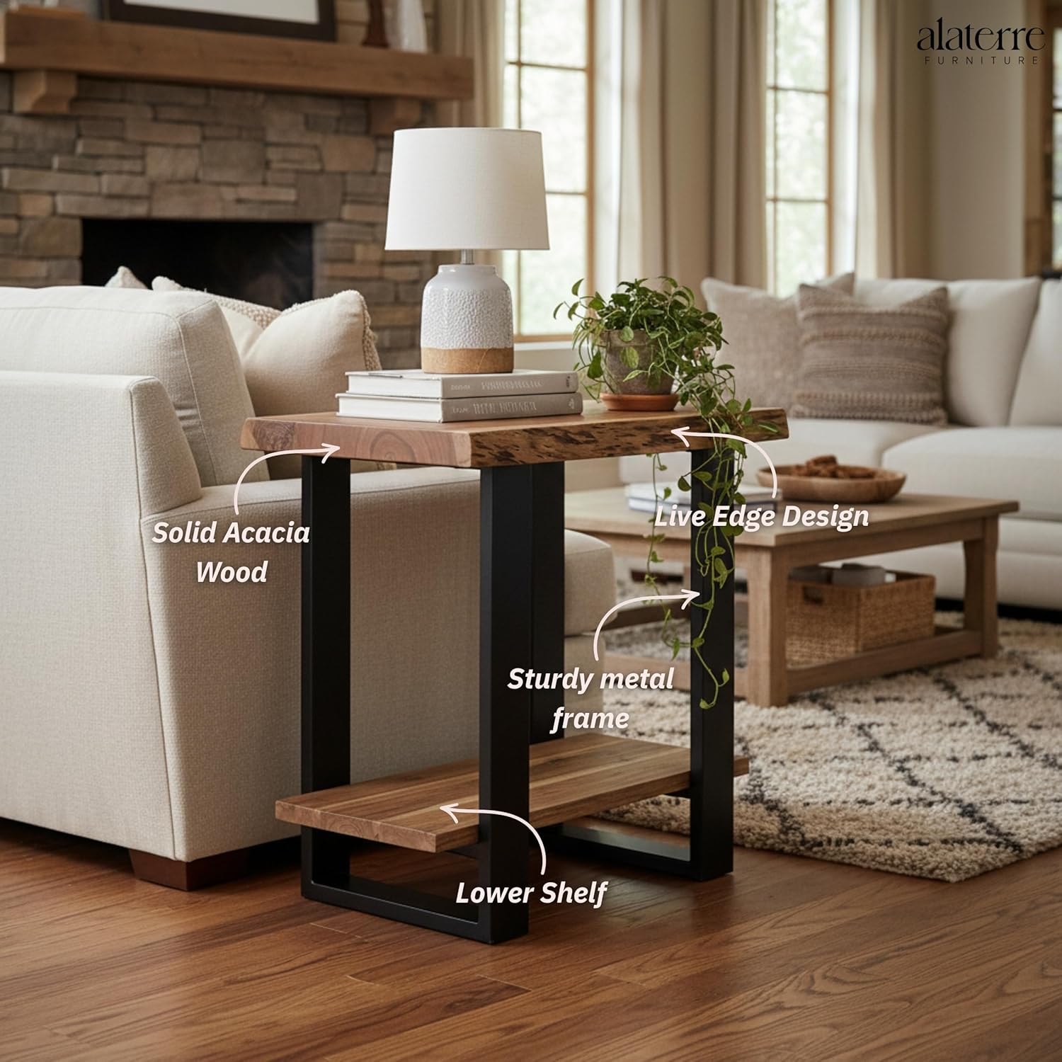 | Item Type Name | Alaterre Furniture Alpine End Table with Live Edge Design and Metal Frame – 2-Tier Solid Acacia Wood Side Table with Storage Shelf – Modern Nightstand or Accent Table for Living Room (27 Inch) |