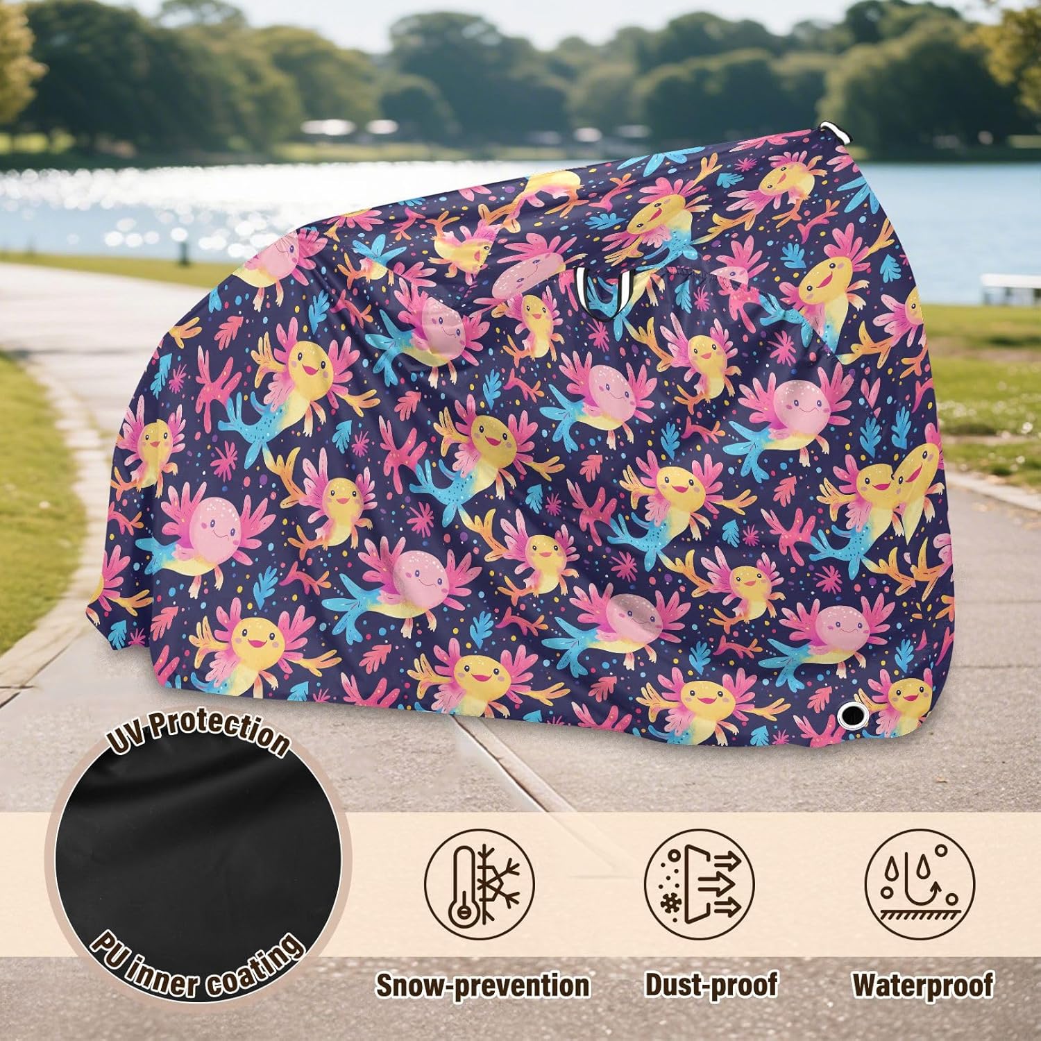 Protect your bicycle in style with our premium bike tarp, engineered for maximum defense against harsh elements. Unlike basic covers, we use specially engineered umbrella waterproof fabric - the same advanced material used in high-end rain umbrellas - delivering superior performance with unique visual appeal. Sun & Heat Defense Our fabric creates a physical cooling barrier that actively lowers your bike's temperature by: Blocking 95%+ harmful UV rays to prevent paint fading Providing exceptional shading & heat insulation (up to 20℉/11℃ reduction vs direct sun) Offering SPF 50+ equivalent protection for sensitive components Rain & Dust Protection Water-repellent coating causes rain to bead and roll off Tightly woven fabric acts as dustproof barrier for long-term storage Prevents moisture buildup with breathable side panels (prevents condensation) User-Focused Design LOCK ACCESS HOLE at front wheel enables secure locking without removing cover ADJUSTABLE BUCKLE STRAP at rear wheel anchors cover during strong winds Reflective safety strips on handles enhance nighttime visibility Ultra-lightweight (23 oz) folds into included pouch Unbeatable Aesthetics Choose from over 1,000 designer patterns - from sleek geometrics to vibrant nature motifs - transforming your bike into a street-style statement while competitors offer only solid colors.