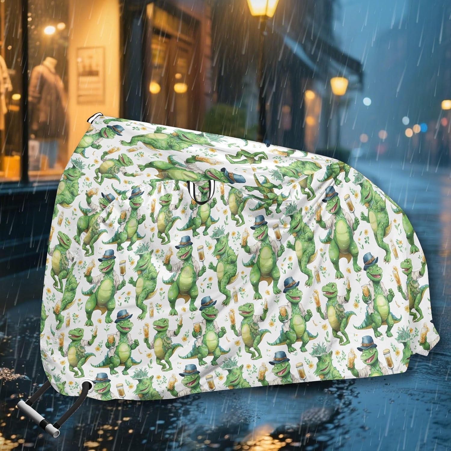Protect your bicycle in style with our premium bike tarp, engineered for maximum defense against harsh elements. Unlike basic covers, we use specially engineered umbrella waterproof fabric - the same advanced material used in high-end rain umbrellas - delivering superior performance with unique visual appeal. Sun & Heat Defense Our fabric creates a physical cooling barrier that actively lowers your bike's temperature by: Blocking 95%+ harmful UV rays to prevent paint fading Providing exceptional shading & heat insulation (up to 20℉/11℃ reduction vs direct sun) Offering SPF 50+ equivalent protection for sensitive components Rain & Dust Protection Water-repellent coating causes rain to bead and roll off Tightly woven fabric acts as dustproof barrier for long-term storage Prevents moisture buildup with breathable side panels (prevents condensation) User-Focused Design LOCK ACCESS HOLE at front wheel enables secure locking without removing cover ADJUSTABLE BUCKLE STRAP at rear wheel anchors cover during strong winds Reflective safety strips on handles enhance nighttime visibility Ultra-lightweight (23 oz) folds into included pouch Unbeatable Aesthetics Choose from over 1,000 designer patterns - from sleek geometrics to vibrant nature motifs - transforming your bike into a street-style statement while competitors offer only solid colors.