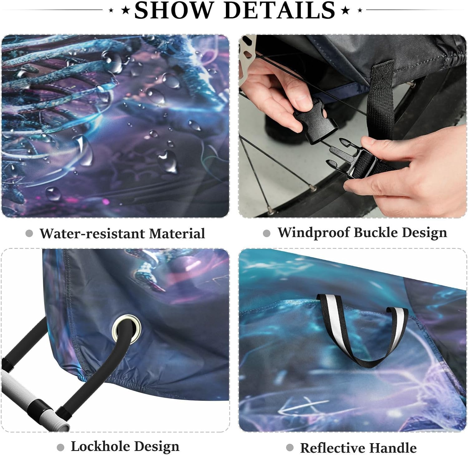 Protect your bicycle in style with our premium bike tarp, engineered for maximum defense against harsh elements. Unlike basic covers, we use specially engineered umbrella waterproof fabric - the same advanced material used in high-end rain umbrellas - delivering superior performance with unique visual appeal. Sun & Heat Defense Our fabric creates a physical cooling barrier that actively lowers your bike's temperature by: Blocking 95%+ harmful UV rays to prevent paint fading Providing exceptional shading & heat insulation (up to 20℉/11℃ reduction vs direct sun) Offering SPF 50+ equivalent protection for sensitive components Rain & Dust Protection Water-repellent coating causes rain to bead and roll off Tightly woven fabric acts as dustproof barrier for long-term storage Prevents moisture buildup with breathable side panels (prevents condensation) User-Focused Design LOCK ACCESS HOLE at front wheel enables secure locking without removing cover ADJUSTABLE BUCKLE STRAP at rear wheel anchors cover during strong winds Reflective safety strips on handles enhance nighttime visibility Ultra-lightweight (23 oz) folds into included pouch Unbeatable Aesthetics Choose from over 1,000 designer patterns - from sleek geometrics to vibrant nature motifs - transforming your bike into a street-style statement while competitors offer only solid colors.