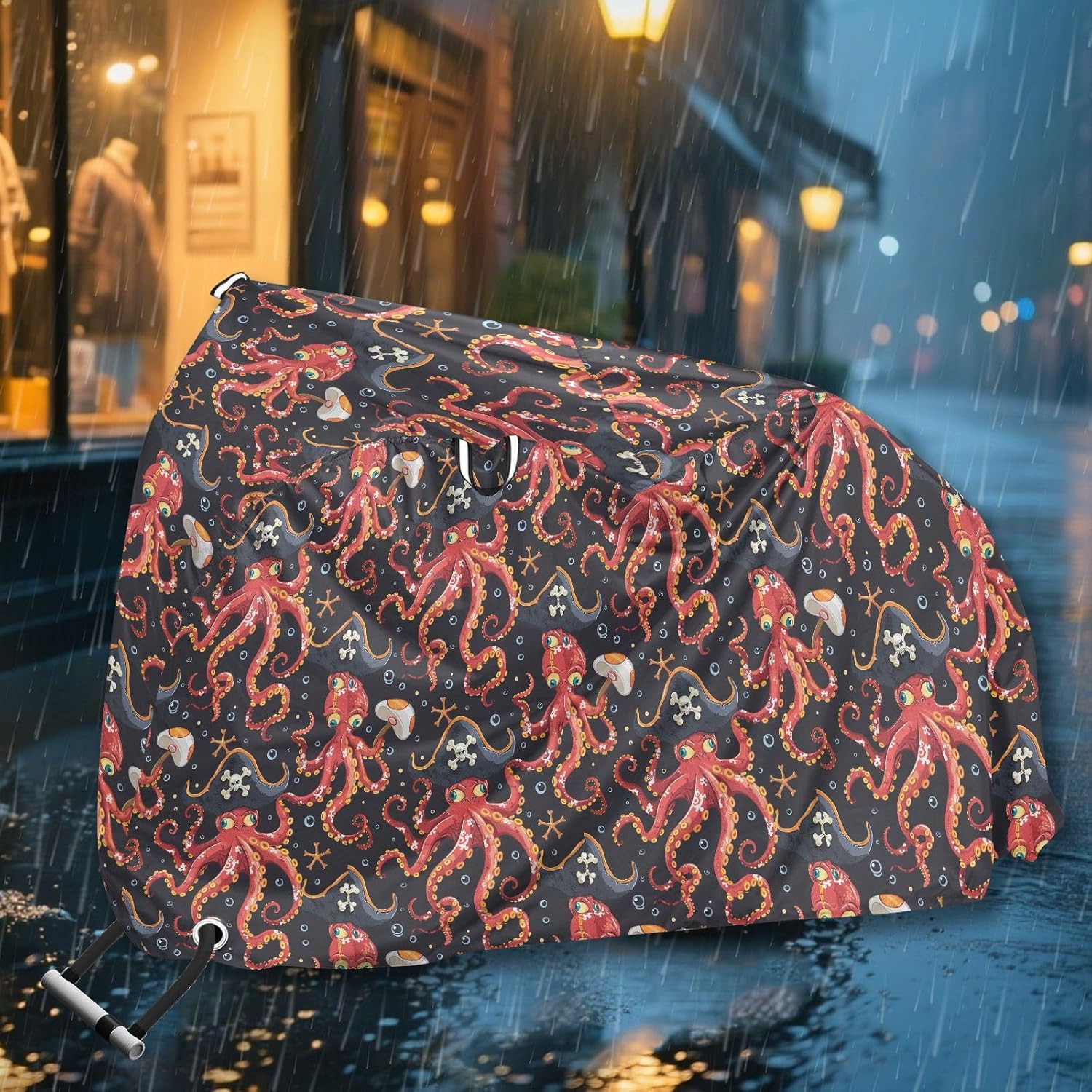 Protect your bicycle in style with our premium bike tarp, engineered for maximum defense against harsh elements. Unlike basic covers, we use specially engineered umbrella waterproof fabric - the same advanced material used in high-end rain umbrellas - delivering superior performance with unique visual appeal. Sun & Heat Defense Our fabric creates a physical cooling barrier that actively lowers your bike's temperature by: Blocking 95%+ harmful UV rays to prevent paint fading Providing exceptional shading & heat insulation (up to 20℉/11℃ reduction vs direct sun) Offering SPF 50+ equivalent protection for sensitive components Rain & Dust Protection Water-repellent coating causes rain to bead and roll off Tightly woven fabric acts as dustproof barrier for long-term storage Prevents moisture buildup with breathable side panels (prevents condensation) User-Focused Design LOCK ACCESS HOLE at front wheel enables secure locking without removing cover ADJUSTABLE BUCKLE STRAP at rear wheel anchors cover during strong winds Reflective safety strips on handles enhance nighttime visibility Ultra-lightweight (23 oz) folds into included pouch Unbeatable Aesthetics Choose from over 1,000 designer patterns - from sleek geometrics to vibrant nature motifs - transforming your bike into a street-style statement while competitors offer only solid colors.