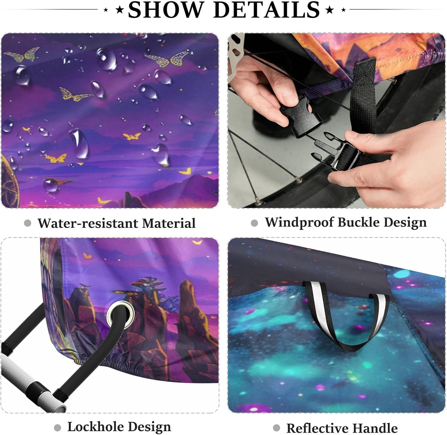 Protect your bicycle in style with our premium bike tarp, engineered for maximum defense against harsh elements. Unlike basic covers, we use specially engineered umbrella waterproof fabric - the same advanced material used in high-end rain umbrellas - delivering superior performance with unique visual appeal. Sun & Heat Defense Our fabric creates a physical cooling barrier that actively lowers your bike's temperature by: Blocking 95%+ harmful UV rays to prevent paint fading Providing exceptional shading & heat insulation (up to 20℉/11℃ reduction vs direct sun) Offering SPF 50+ equivalent protection for sensitive components Rain & Dust Protection Water-repellent coating causes rain to bead and roll off Tightly woven fabric acts as dustproof barrier for long-term storage Prevents moisture buildup with breathable side panels (prevents condensation) User-Focused Design LOCK ACCESS HOLE at front wheel enables secure locking without removing cover ADJUSTABLE BUCKLE STRAP at rear wheel anchors cover during strong winds Reflective safety strips on handles enhance nighttime visibility Ultra-lightweight (23 oz) folds into included pouch Unbeatable Aesthetics Choose from over 1,000 designer patterns - from sleek geometrics to vibrant nature motifs - transforming your bike into a street-style statement while competitors offer only solid colors.