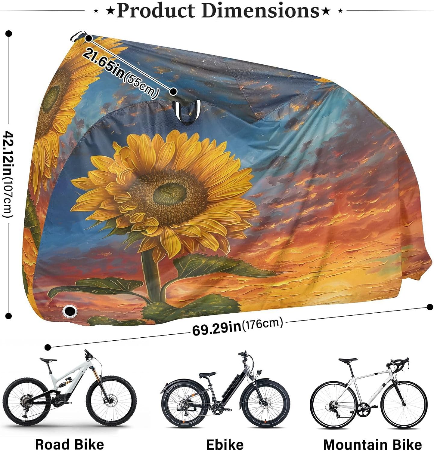 Protect your bicycle in style with our premium bike tarp, engineered for maximum defense against harsh elements. Unlike basic covers, we use specially engineered umbrella waterproof fabric - the same advanced material used in high-end rain umbrellas - delivering superior performance with unique visual appeal. Sun & Heat Defense Our fabric creates a physical cooling barrier that actively lowers your bike's temperature by: Blocking 95%+ harmful UV rays to prevent paint fading Providing exceptional shading & heat insulation (up to 20℉/11℃ reduction vs direct sun) Offering SPF 50+ equivalent protection for sensitive components Rain & Dust Protection Water-repellent coating causes rain to bead and roll off Tightly woven fabric acts as dustproof barrier for long-term storage Prevents moisture buildup with breathable side panels (prevents condensation) User-Focused Design LOCK ACCESS HOLE at front wheel enables secure locking without removing cover ADJUSTABLE BUCKLE STRAP at rear wheel anchors cover during strong winds Reflective safety strips on handles enhance nighttime visibility Ultra-lightweight (23 oz) folds into included pouch Unbeatable Aesthetics Choose from over 1,000 designer patterns - from sleek geometrics to vibrant nature motifs - transforming your bike into a street-style statement while competitors offer only solid colors.
