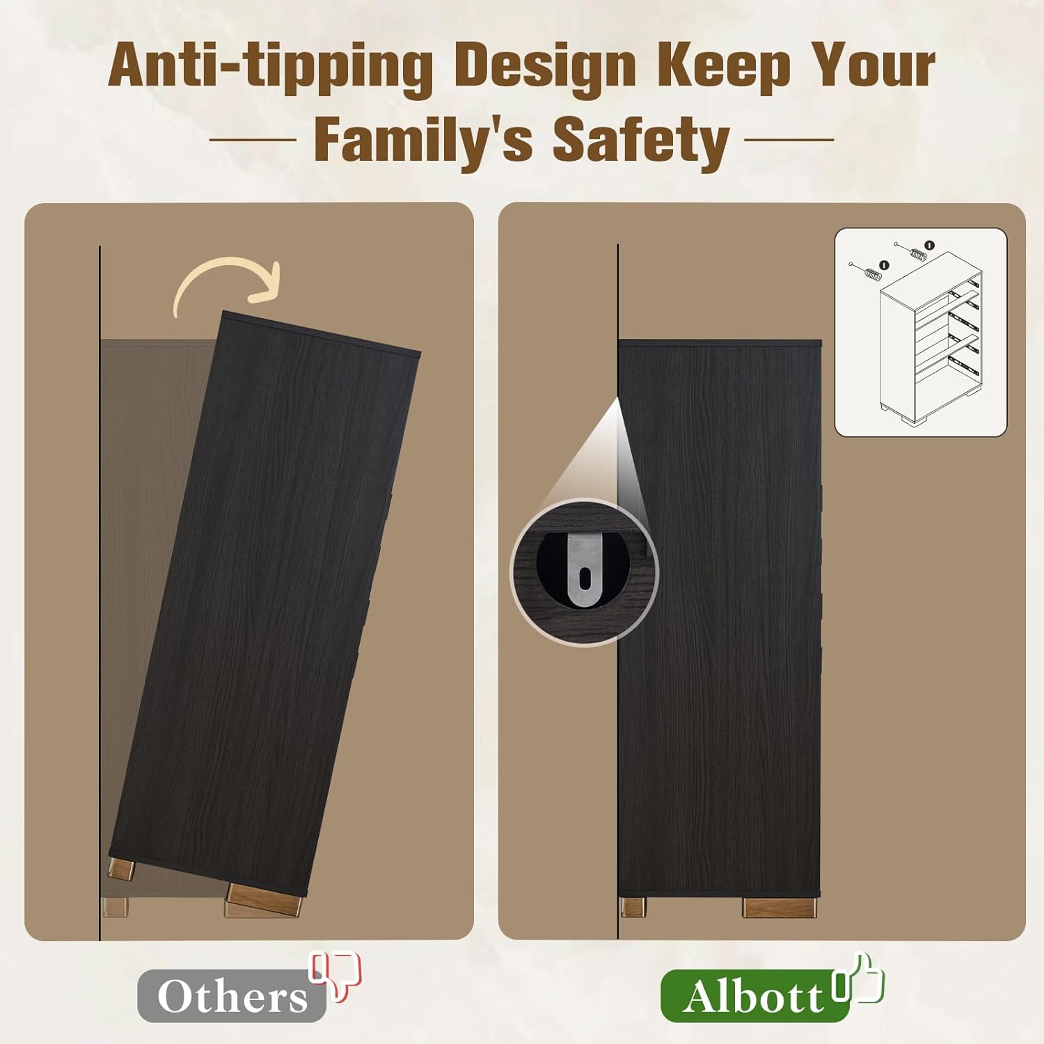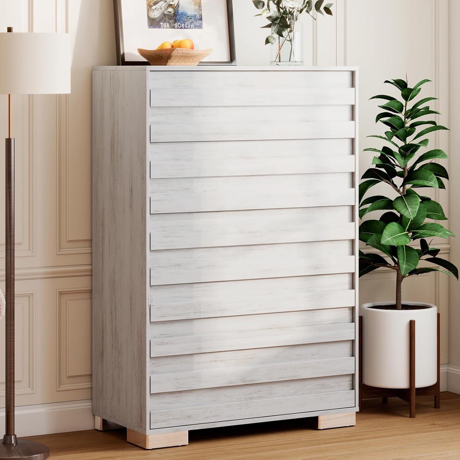 Albott 5 drawer dresser for bedroom, wood rustic wide chest of drawers, farmhouse storage dresser with hidden handles, can be matched to any scene in your home. Living room, bedroom, entrance, etc. Ample storage space to make your home life more organized and tidy. Bringing you a different life experienceSpecifications:Color: Distressed White/Rustic Grey/BlackDimensions: 31.3"L×15.7"D×47.4" H (Drawer:28.2"L×13.3"D×3.9" H)Material: Engineered Wood, MetalAssembly Required: YESApplicable Room: Entrance, Bedroom, Living RoomFeatures:① 5 Ample Storage space② Unique 45°hidden handle③ Pre-installed slide rail④ Glossy stainless steel finish foot