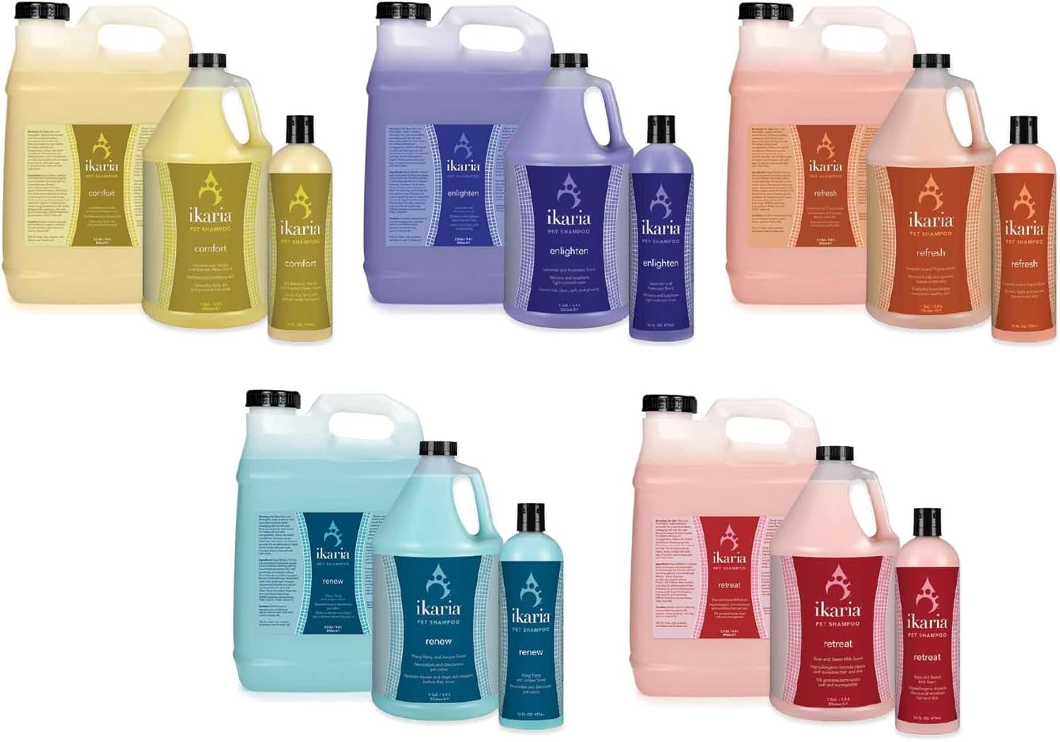 Our popular Dog and Cat Pet Grooming Shampoos have been reformulated with richer and more luxurious ingredients to pamper pets. These spa inspired grooming shampoos are made with natural botanicals for a rich, restorative cleaning experience. Refresh Shampoo is our signature everyday formula that leaves a long-lasting grapefruit thyme scent. Dilutes 10:1. Retreat Shampoo is a tearless and hypoallergenic formula with calming soft rose and sweet milk proteins. Dilutes 6:1 Comfort Oatmeal Shampoo has soothing ingredients that comfort and calm, dry itchy skin. Dilutes 6:1. Renew Shampoo helps neutralize naturally occurring pet odors. Dilutes 6:1. Enlighten Shampoo naturally whitens, brightens, and conditions light-colored coats. Dilutes 8:1. Safe for puppies and kittens over 8 weeks old. Reformulated conditioner and coat mists are also available. Available in 16oz, 1 Gallon or 2.5 Gallons Directions for Use: wet coat thoroughly. Apply shampoo and work into a luxurious later, massaging well into the coat. Rinse and repeat for best results. For added softness and manageability, follow with Conditioner. Shampoo can be diluted as much as 8:1. for external use only. Do not allow pets to ingest. Avoid contact with pets eyes. If contact occurs rinse well with fresh water.