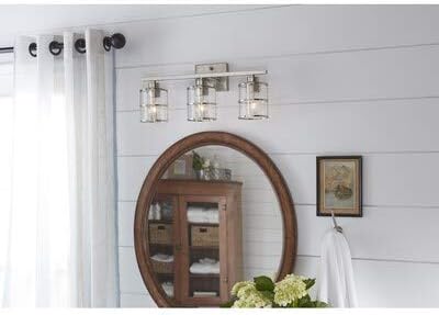 Collection Name: Kenross Type Vanity light: bar Number of Lights: 3 Style: Traditional Theme: Industrial Shape: Cage Length (Inches): 21.26 Height (Inches): 8.66 Depth (Inches): 5.91 Weight (lbs.): 4.16 Shade Included: Yes Lighting Direction: Downlighting Fitter Type: N/A Fixture Material: Metal Shade Material: Glass Glass Type: Ribbed glass Frosted Glass: No Bulbs Included: No Number of Bulbs Required: 3 Number of Bulbs Included: 0 Maximum Bulb Wattage (or Equivalent): 60 Bulb Type: Standard Light Bulb Base Type: Medium base (E-26) Recommended Light Bulb Shape: A19 Hardwired or Plug-In: Hardwired Dimmable: Yes Mounting Hardware Included: Yes For Use in Kitchens: Yes For Use in Dining Rooms: Yes For Use in Bathrooms: Yes For Use in Foyers: Yes For Use in Bedrooms: Yes For Use in Living Rooms: Yes UL Safety Listing: Yes CSA Safety Listing: Yes ETL Safety Listing: Yes ADA Approved: No Usage Rating: Damp rated ENERGY STAR Certified: No Shade Color: Clear glass Fixture Color Family: Nickel Fixture Finish: Brushed Manufacturer Color/Finish: Brushed nickel