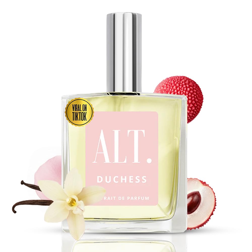 ALT. FRAGRANCES Duchess is a beautifully crafted perfume for women inspired by the elegance of Delina. This long lasting perfume opens with bright lychee and rhubarb, creating a refreshing fruity introduction that feels youthful and uplifting. At the heart, delicate rose notes add a soft floral richness, while subtle musk and fruit accords create a smooth, balanced finish. Designed as an extrait de parfum, Duchess delivers strong staying power with just a small application. The refined blend makes it perfect for both everyday use and special occasions, offering the charm of designer perfumes for women in a modern, wearable style. This travel size perfume is easy to carry, making it a convenient companion for workdays, evenings out, or weekend trips. Whether you're exploring alt perfume collections or looking for a signature scent, this fragrance provides a floral fruity aroma that feels both feminine and timeless. ALT. Fragrances is known for crafting cruelty-free, vegan women’s fragrance alternatives that combine quality with accessibility. Duchess captures sophistication, confidence, and grace in every spray, making it a versatile addition to any perfume collection.