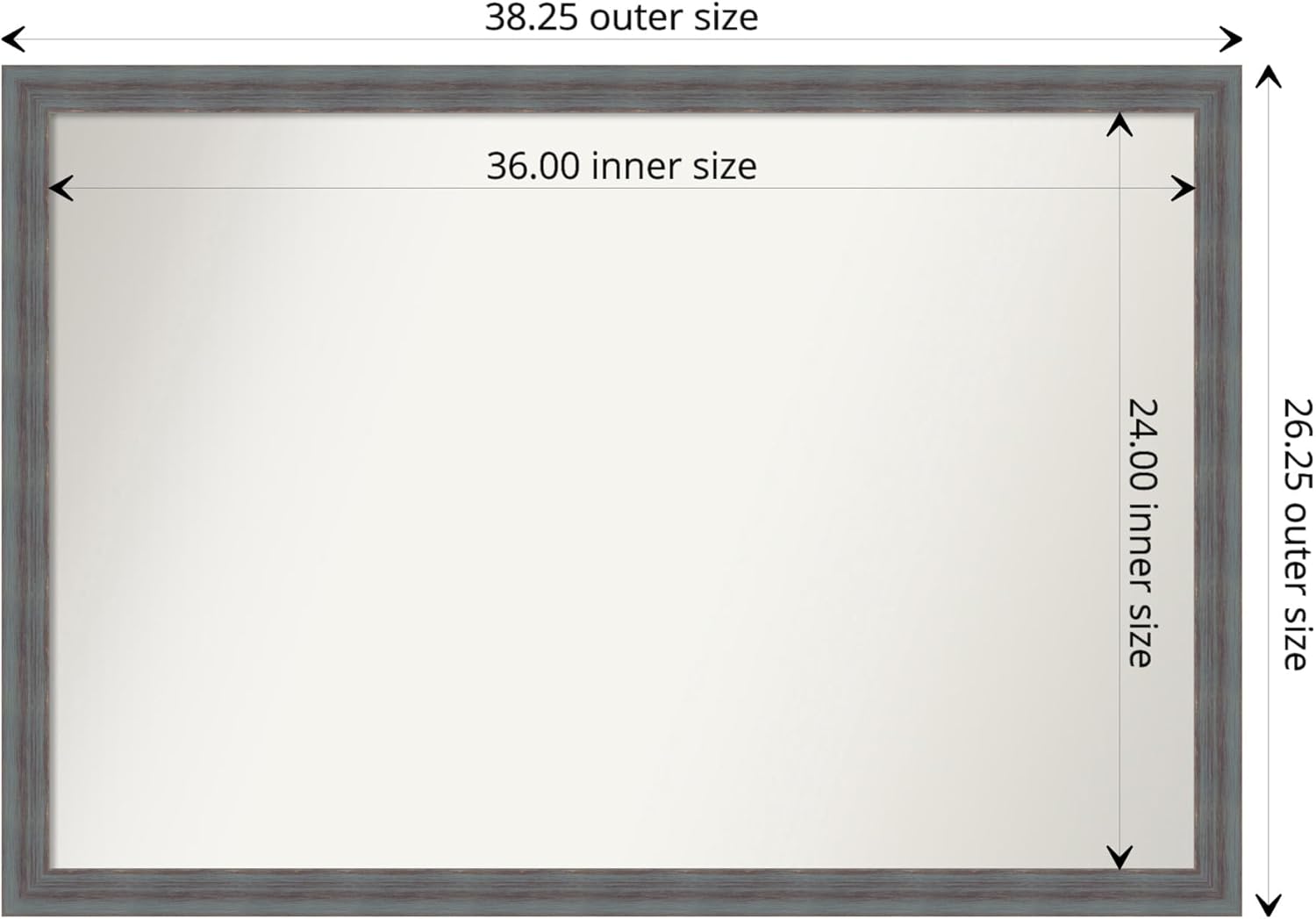 PRODUCT: Amanti Art Non-Beveled Wood Bathroom Wall Mirror; OUTER SIZE: Exactly 38.25 x 26.25 inches; FRAME: Dixie Blue Grey Rustic; FRAME FINISH: Distressed; FRAME COLOR: Blue. The Dixie Blue Grey Rustic frame is a rustic, blue-grey frame with a distressed, weathered finish on its flat surface. Give your bathroom the finishing touch with this 100% real wood-framed wall mirror. Individually made using traditional custom framing techniques, it has the quality you would expect from your local frame shop. It holds its value with premium finishing that can be appreciated up close. Because of our attention to detail and focus on artistry, architects, interior designers, and homeowners alike choose this mirror to create beautiful living spaces.