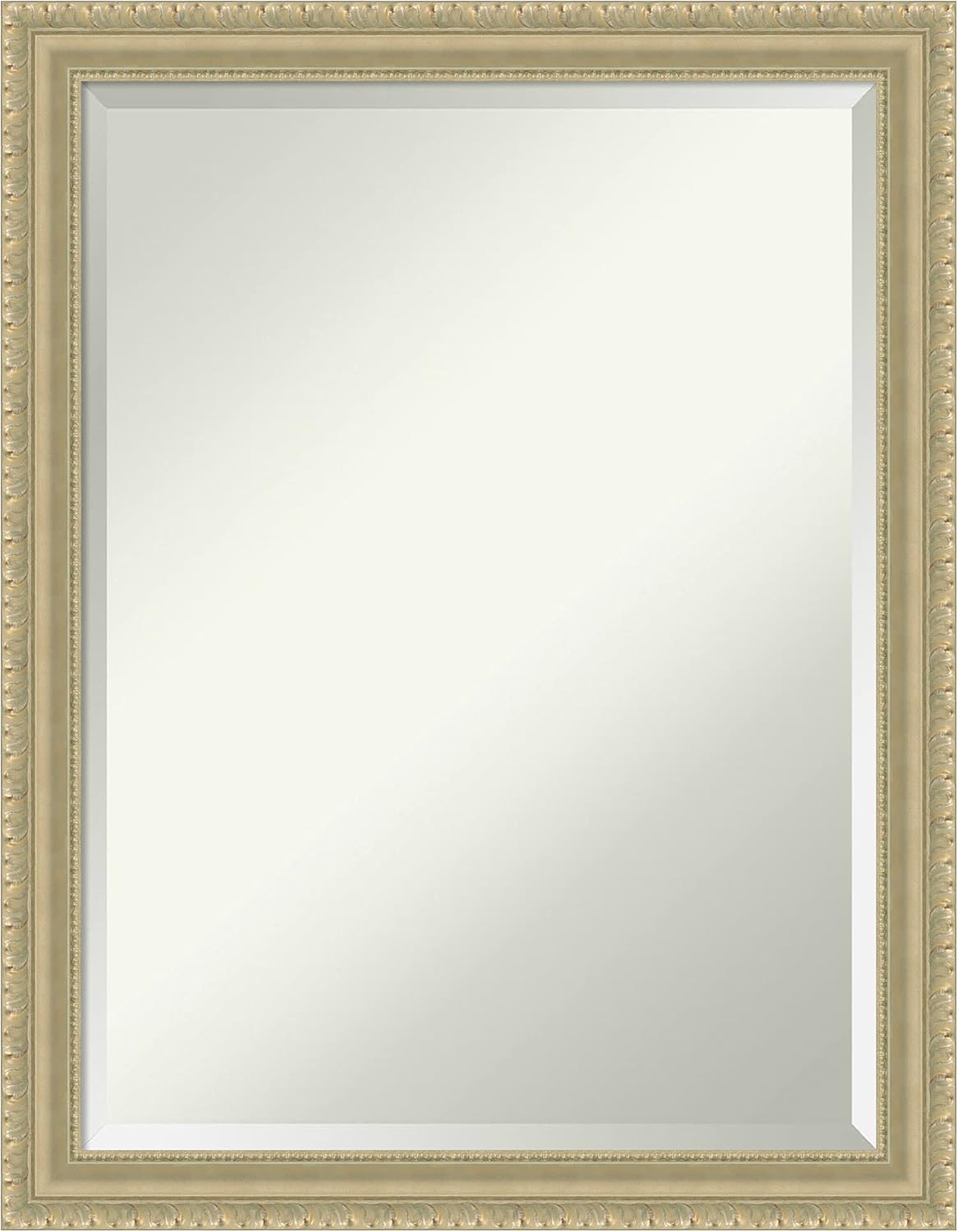 PRODUCT: Amanti Art Beveled Wood Wall Mirror; OUTER SIZE: Exactly 43 x 33 inches; FRAME: Champagne Teardrop; FRAME FINISH: Antique Champagne; FRAME COLOR: Gold. The Champagne Teardrop frame is a light champagne frame with elevated teardrop design on the outer edge, beading on the inner lip. The sides swoop inward. Give your home or office the finishing touch with this 100% real wood-framed wall mirror. Individually made using traditional custom framing techniques, it has the quality you would expect from your local frame shop. It holds its value with premium finishing that can be appreciated up close. Because of our attention to detail and focus on artistry, architects, interior designers, and homeowners alike choose this mirror to create beautiful living spaces.