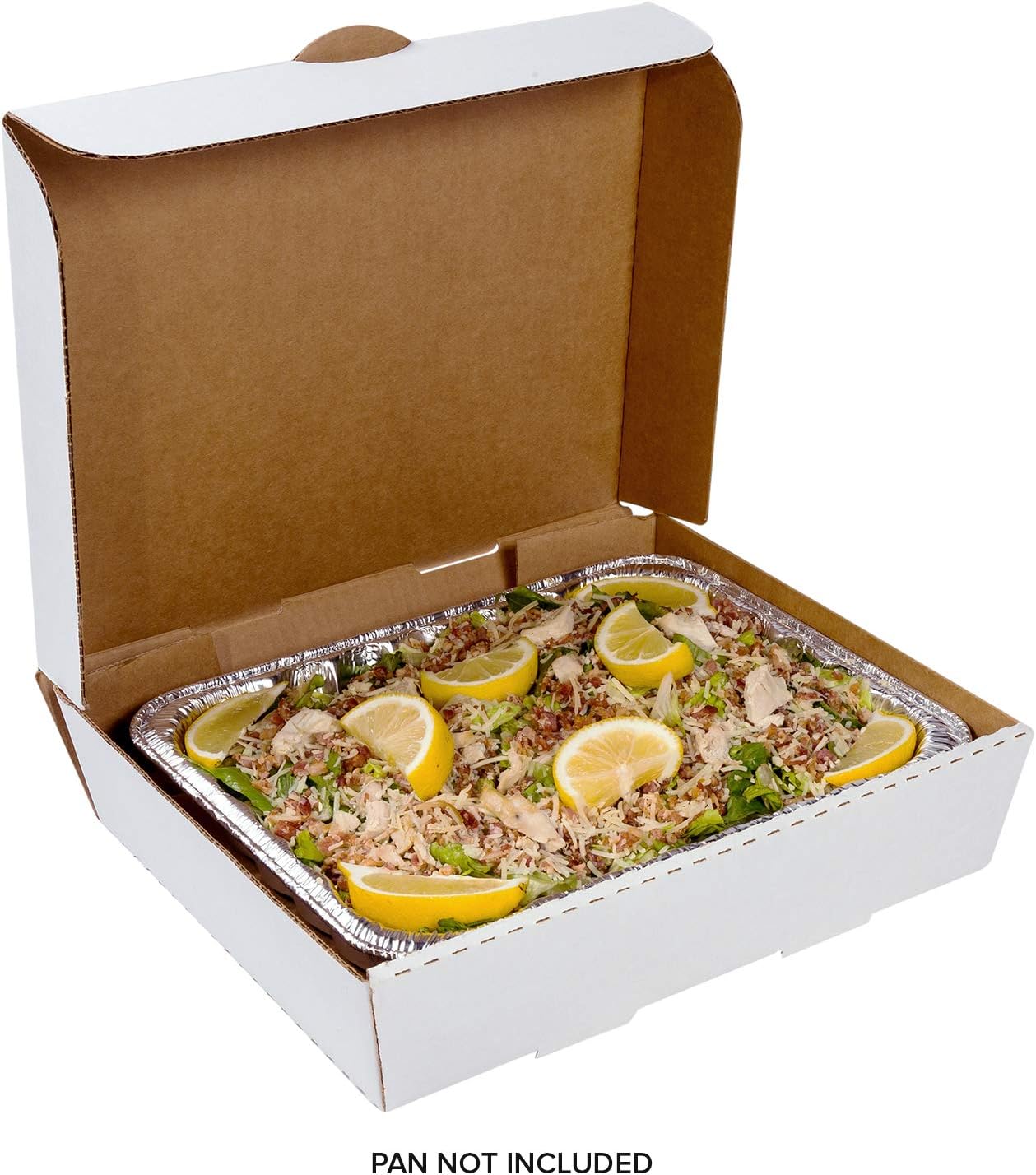 AmerCareRoyal White Half Pan Corrugated Catering Box provides reliable packaging for transporting food securely. Measuring 13” x 10-7/8” x 3”, this sturdy corrugated box is designed to hold standard half-size pans, with angled sides that make stacking and carrying easier. Built-in vents support airflow to help manage condensation, while the strong corrugated construction offers durability during transport. The clean white exterior delivers a polished, professional look that’s well-suited for catering services, restaurants, bakeries, and delivery operations. Ideal for transporting pasta, sandwiches, baked goods, and other menu items, this half pan catering box combines strength and functionality to help maintain food quality and presentation from kitchen to customer.