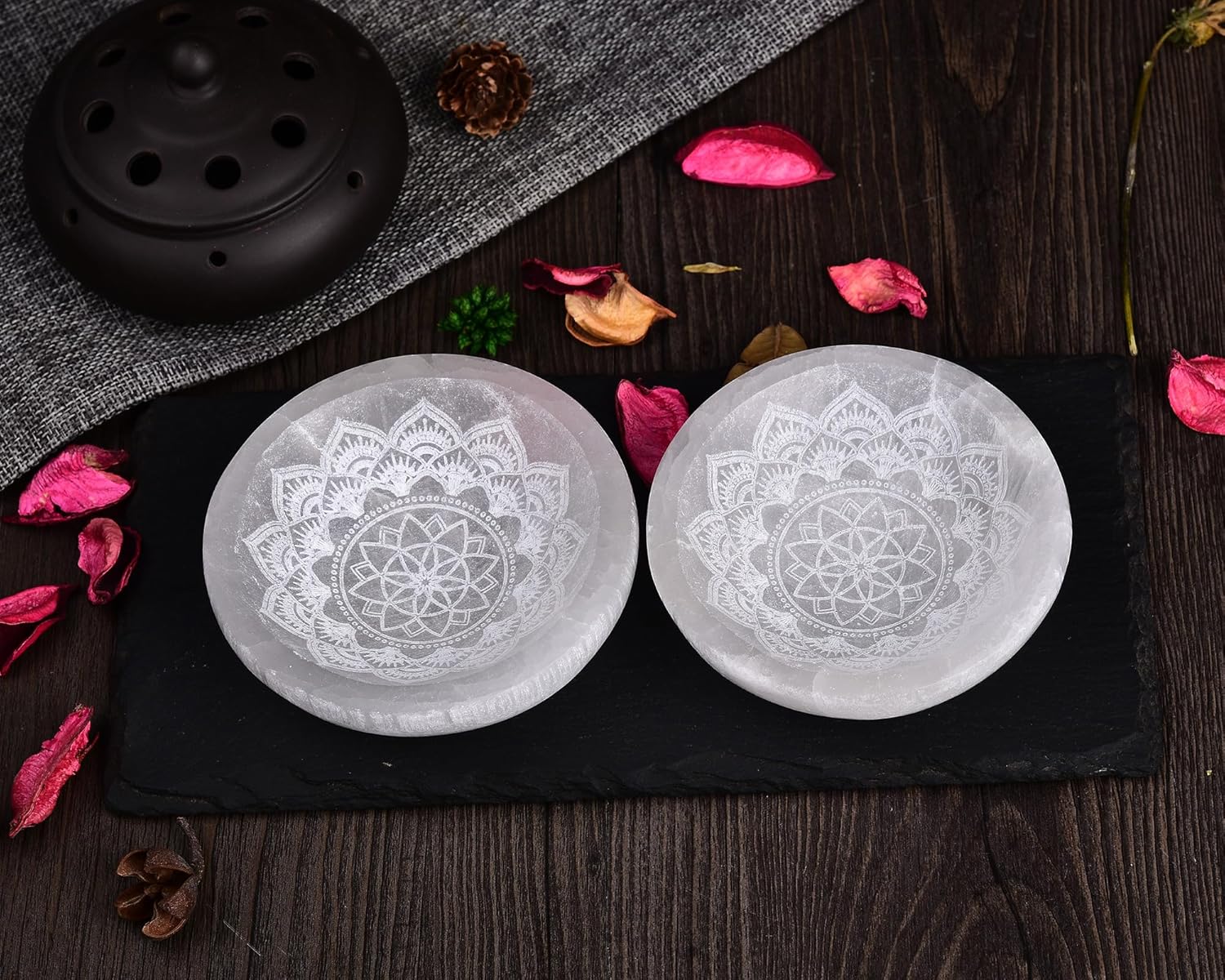 Natural Selenite Bowl for Charging Selenite Plate Mandala Engraved Selenite Dish Crystal Bowl 5.5"