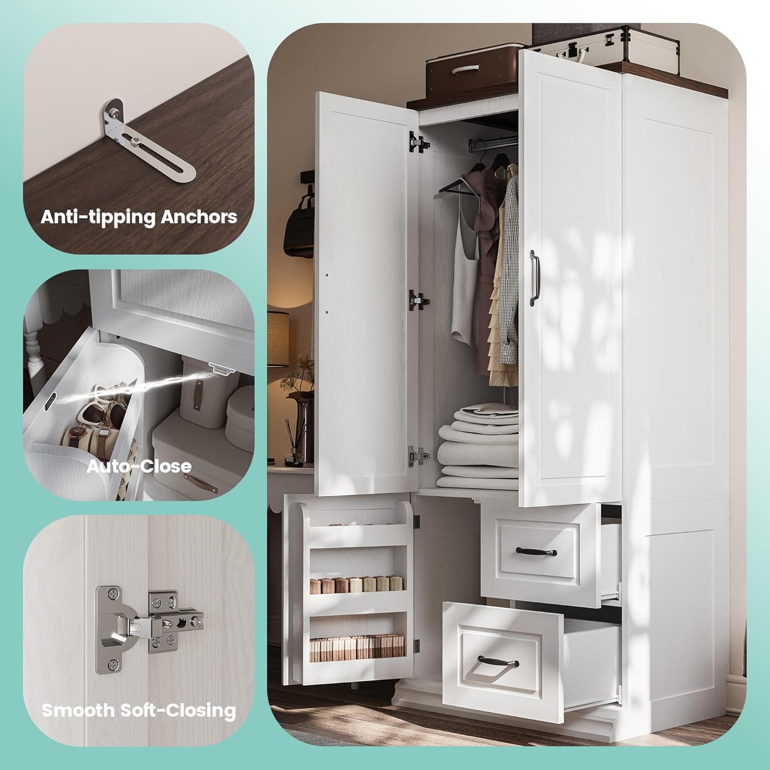 | Additional Features | 3 Doors with 2 Drawers, Anti-Tipping, Door Racks, Hanging Rod |
