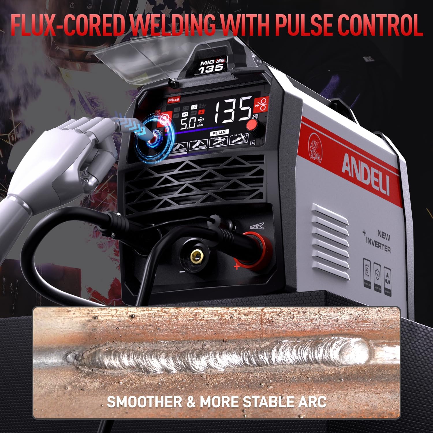 | Included Components | ANDELI MIG-135 Plus Welder*1, Gasless Wire*1,Welding Hood*1,Welding Glasses(Auto Darkening)*1,Leather Welding Gloves*1,Electrode Holder*1, Welding Torch*1 |